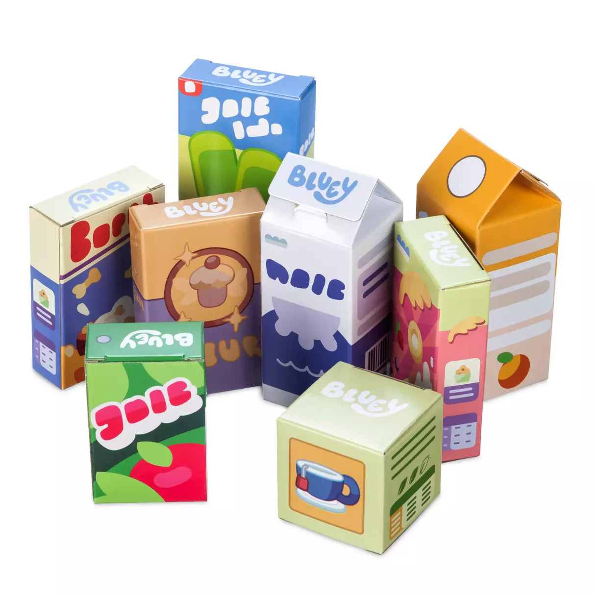 Incluye ocho cajas de comida de juguete que incluyen té, leche, harina, jugo de manzana, jugo de naranja, golosinas para perros, paletas heladas y cereal.