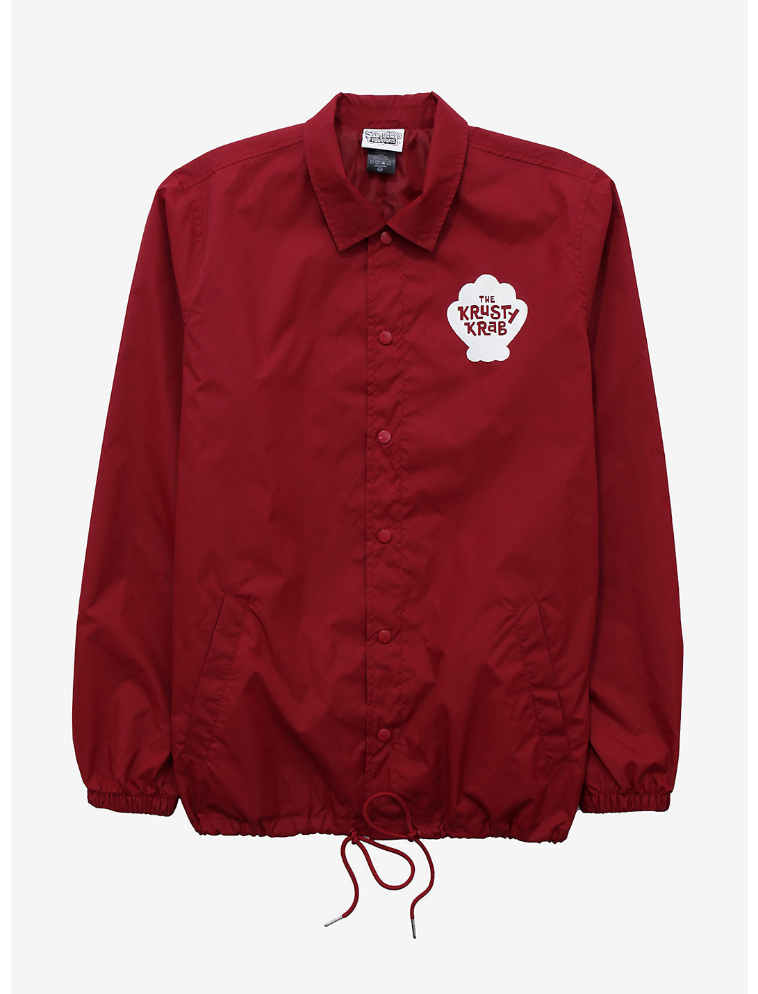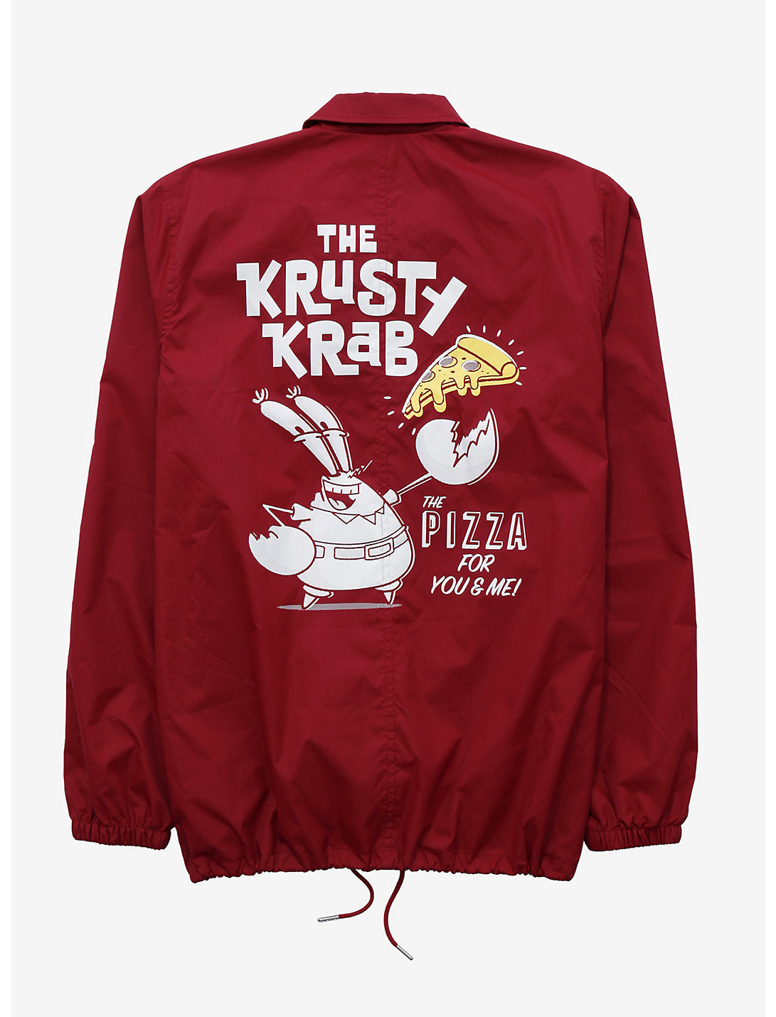 ¡Esta es la chaqueta del entrenador para ti y para mí! Inspirada en el episodio clásico de SpongeBob SquarePants, "Pizza Delivery", esta chaqueta presenta el logotipo de Krusty Krab en el pecho, un gráfico de Krusty Krab Pizza en la parte posterior con el Sr. Krabs, botones a presión en la parte delantera y un cordón en la cintura.