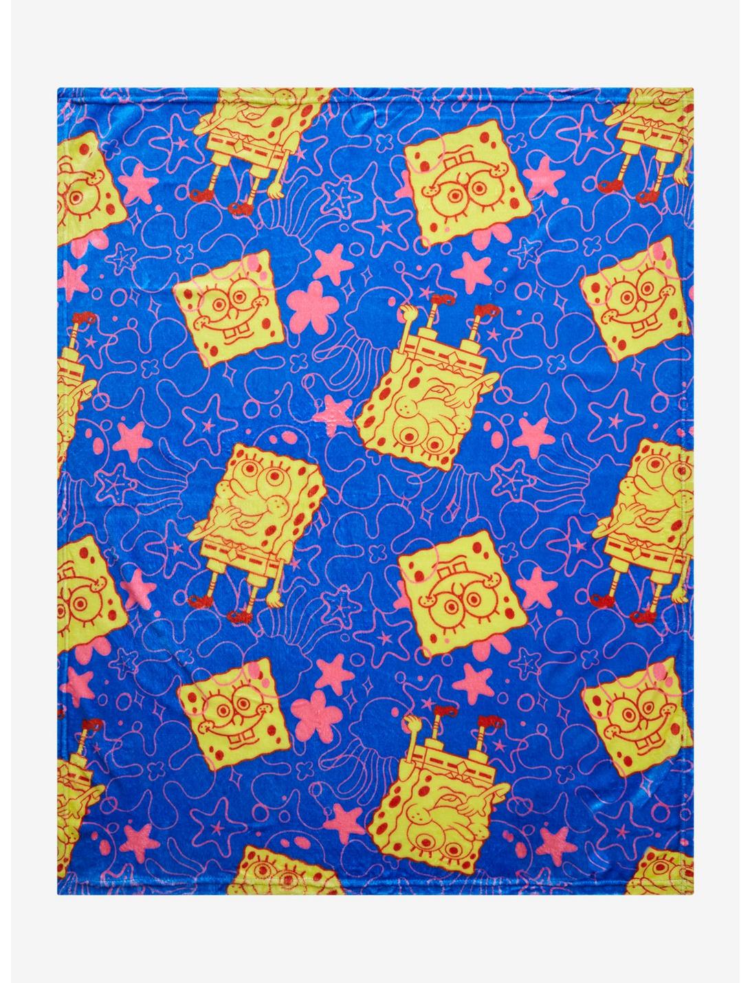 Coge este juego de almohada y manta abrazador protagonizado por Bob Esponja como la almohada abrazadora figurativa; la manta muestra diferentes versiones de él sonriendo.