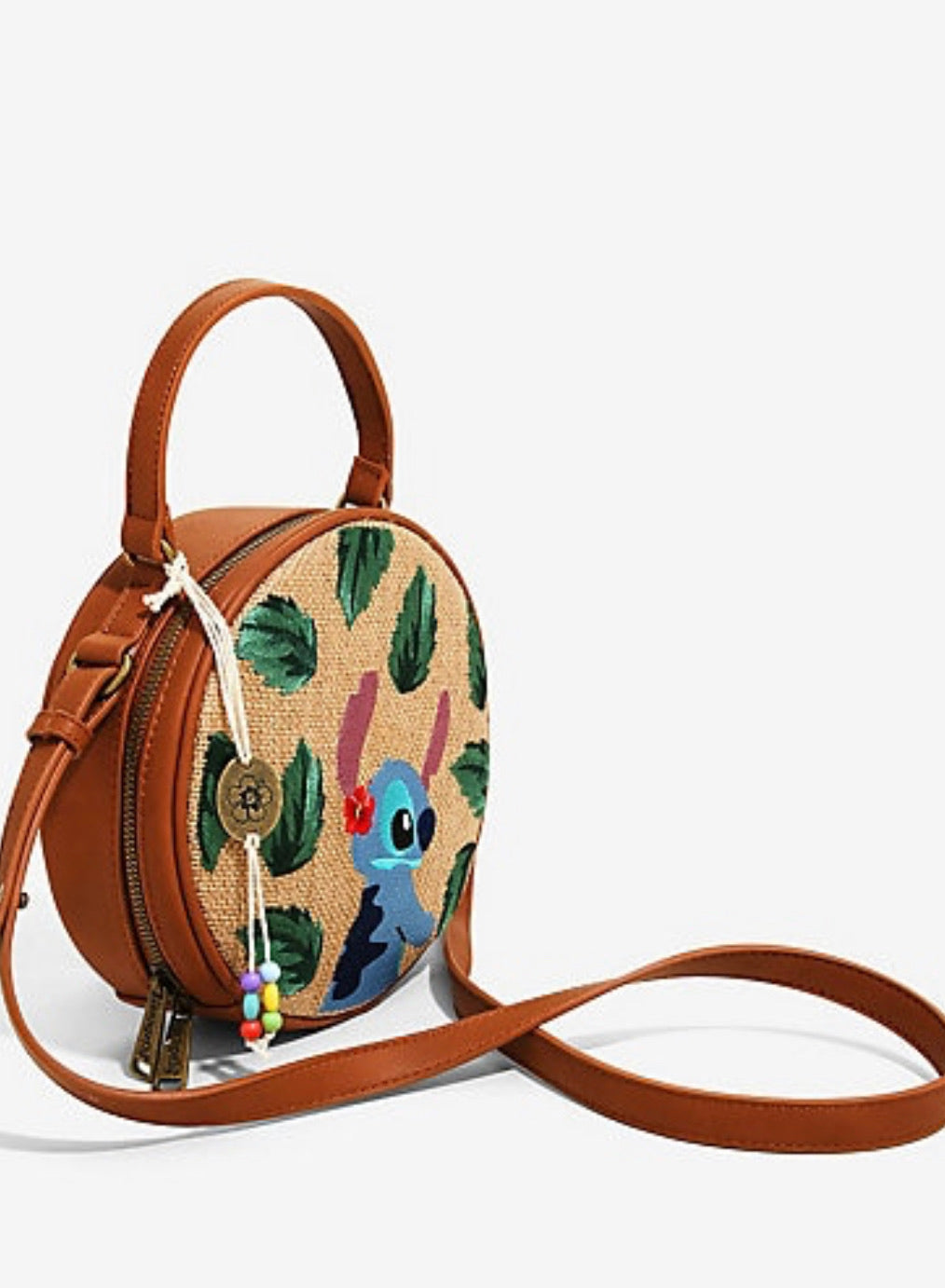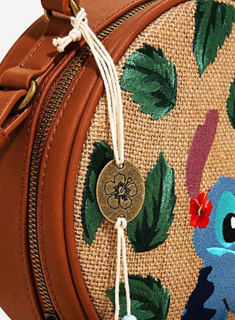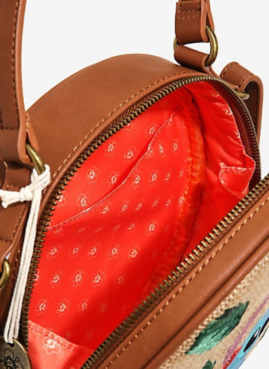 Este bolso bandolera Inspirado en Disney's Lilo & Stitch, pertenece a las cálidas arenas de Hawái junto a Stitch y sus amigos. Cuenta con detalles bordados de alta calidad en la parte delantera y trasera, laterales y correas de piel sintética, cremallera en tono bronce, adorno de borla con cuentas, forro interior de color naranja floral con un bolsillo desplegable y una insignia de la marca de esmalte.