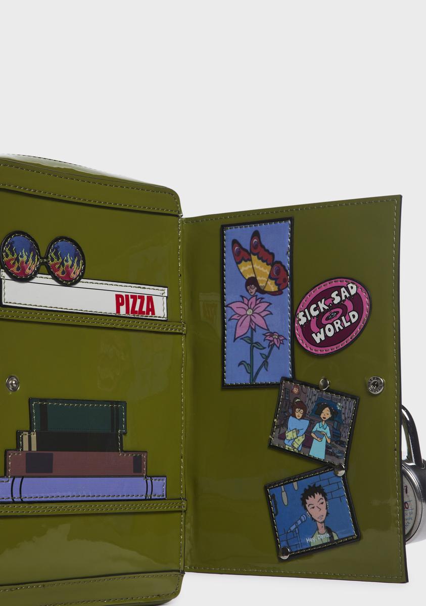 ¿Ya es universidad? Este bolso tiene una construcción de PVC, un diseño de casillero con un candado genuino con combinación e instrucciones, un gráfico holográfico con el nombre de Daria en el frente, diseños de Daria bordados cuando abres la solapa del casillero, un cierre con botón a presión