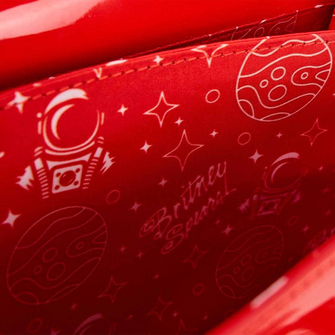 Este bolso bandolera rinde homenaje a su videoclip "Oops!...I Did It Again". Es de piel sintética de charol rojo brillante y lleva un dije metálico plateado con la silueta de Britney en la parte delantera. En la trasera, encontrarás la inscripción "Oops! I Did It Again" en papel plateado.