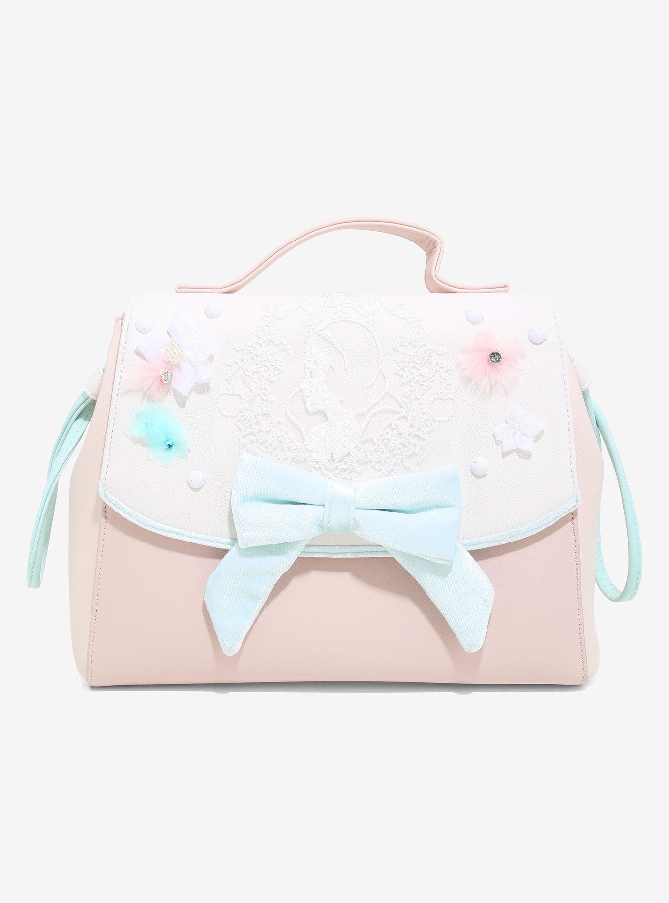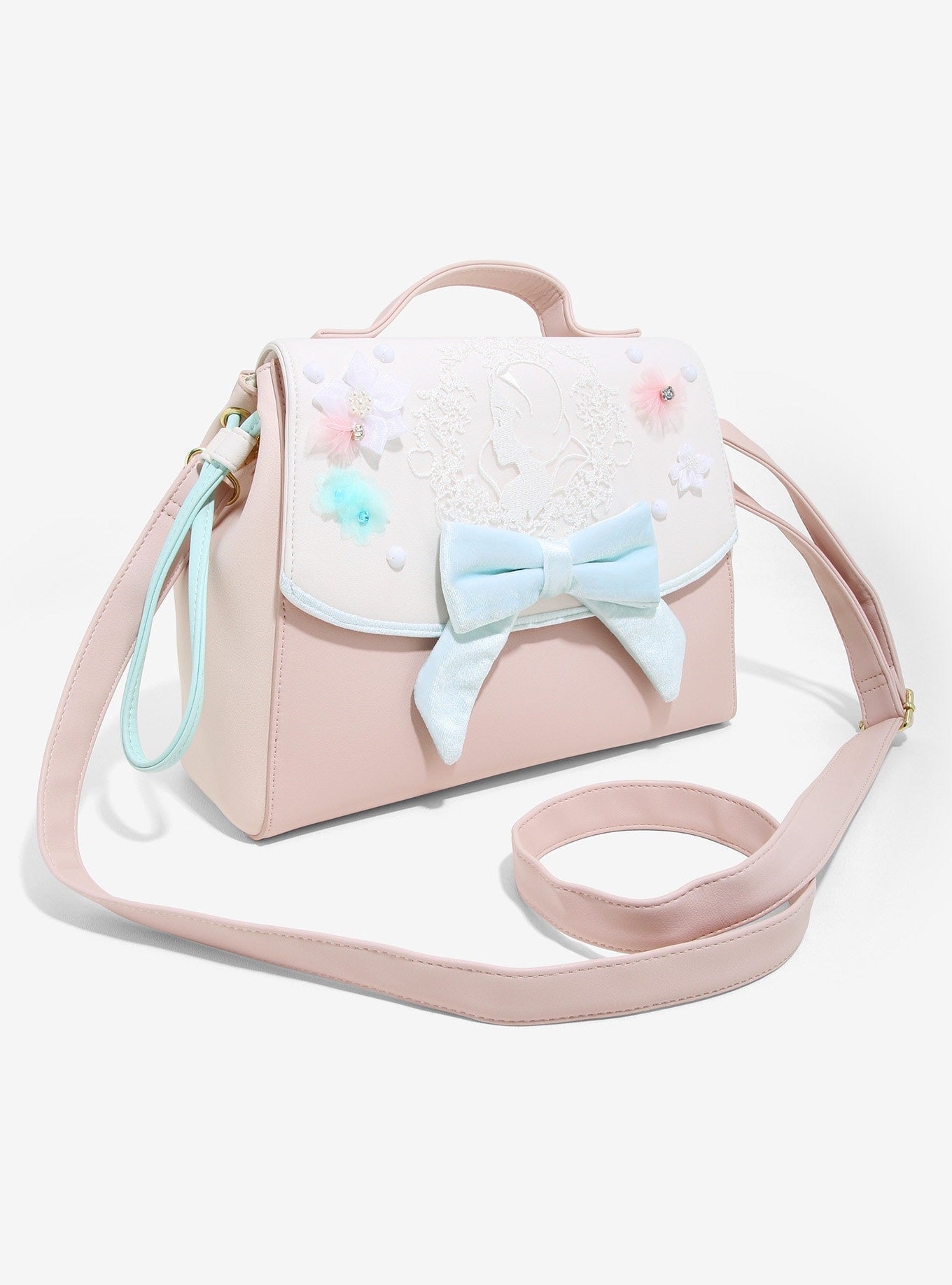 Adecuado para una princesa encantadora, este bolso de piel sintética rosa de presenta un lazo aterciopelado azul celeste, placa de metal, cordones en los lados y detalles de encaje, bordados y gráficos inspirados en Blancanieves y los siete enanitos de Disney.