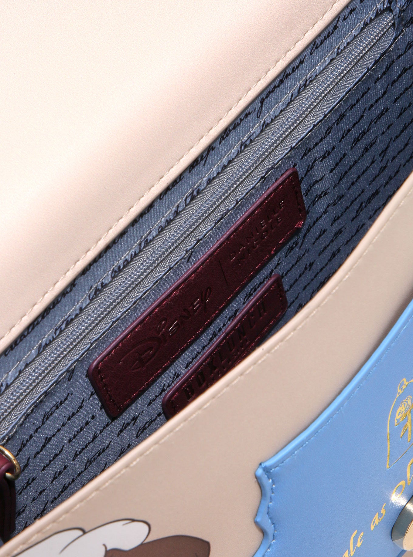 ¡Vuelve a contar un cuento tan antiguo como el tiempo dondequiera que vayas con este bolso con forma de libro de cuentos! Bella y su príncipe viven felices para siempre en el interior de la solapa, frente a un bolsillo troquelado con la marca de un mordisco de una encantadora oveja.