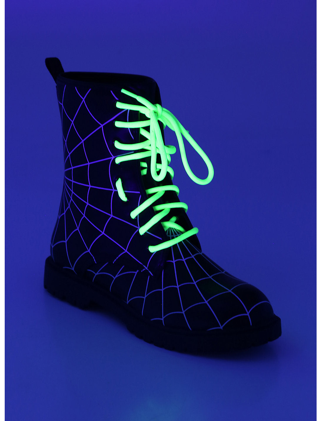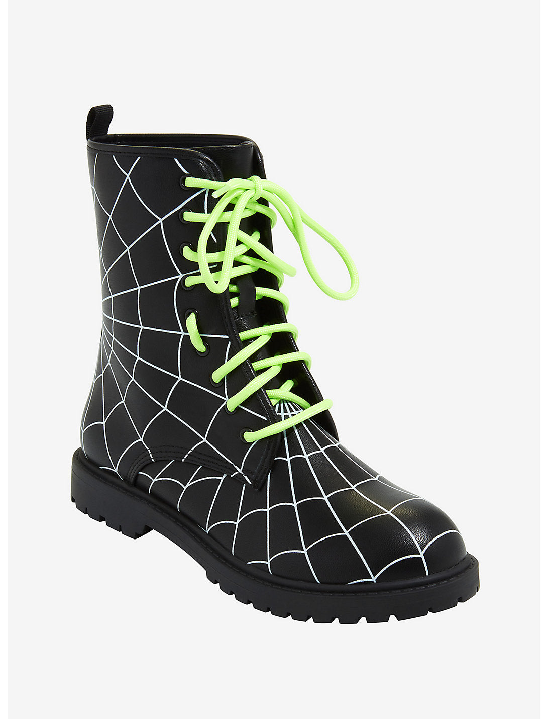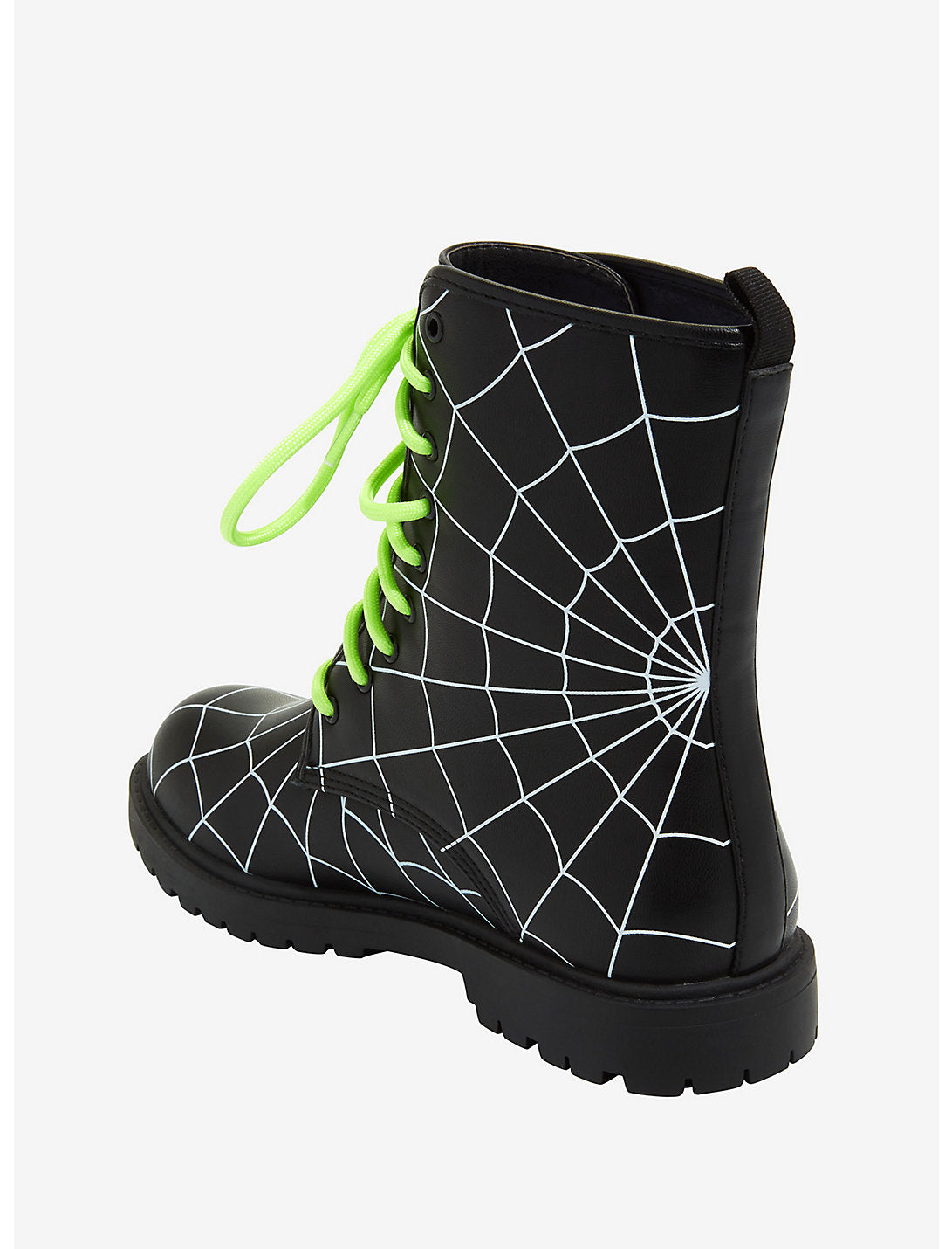 - ¡Estas botas de combate seguramente te atraparán en una red de cumplidos! Presenta un diseño de telaraña en piel sintética con cordones de color verde neón que brillan en la oscuridad.