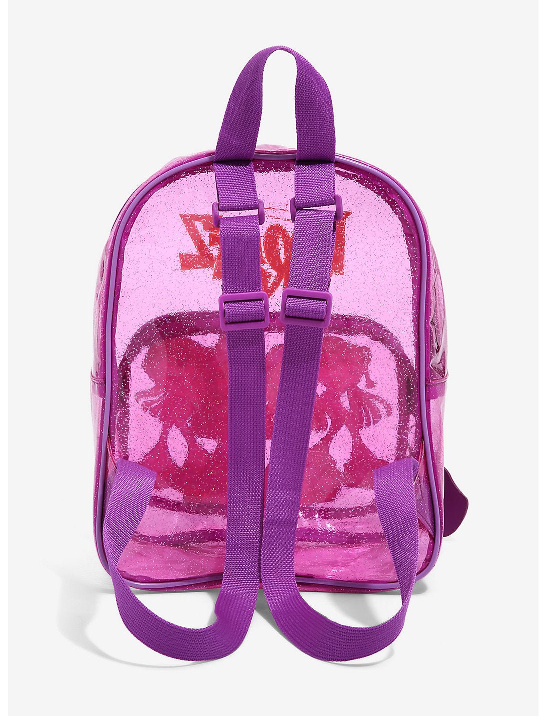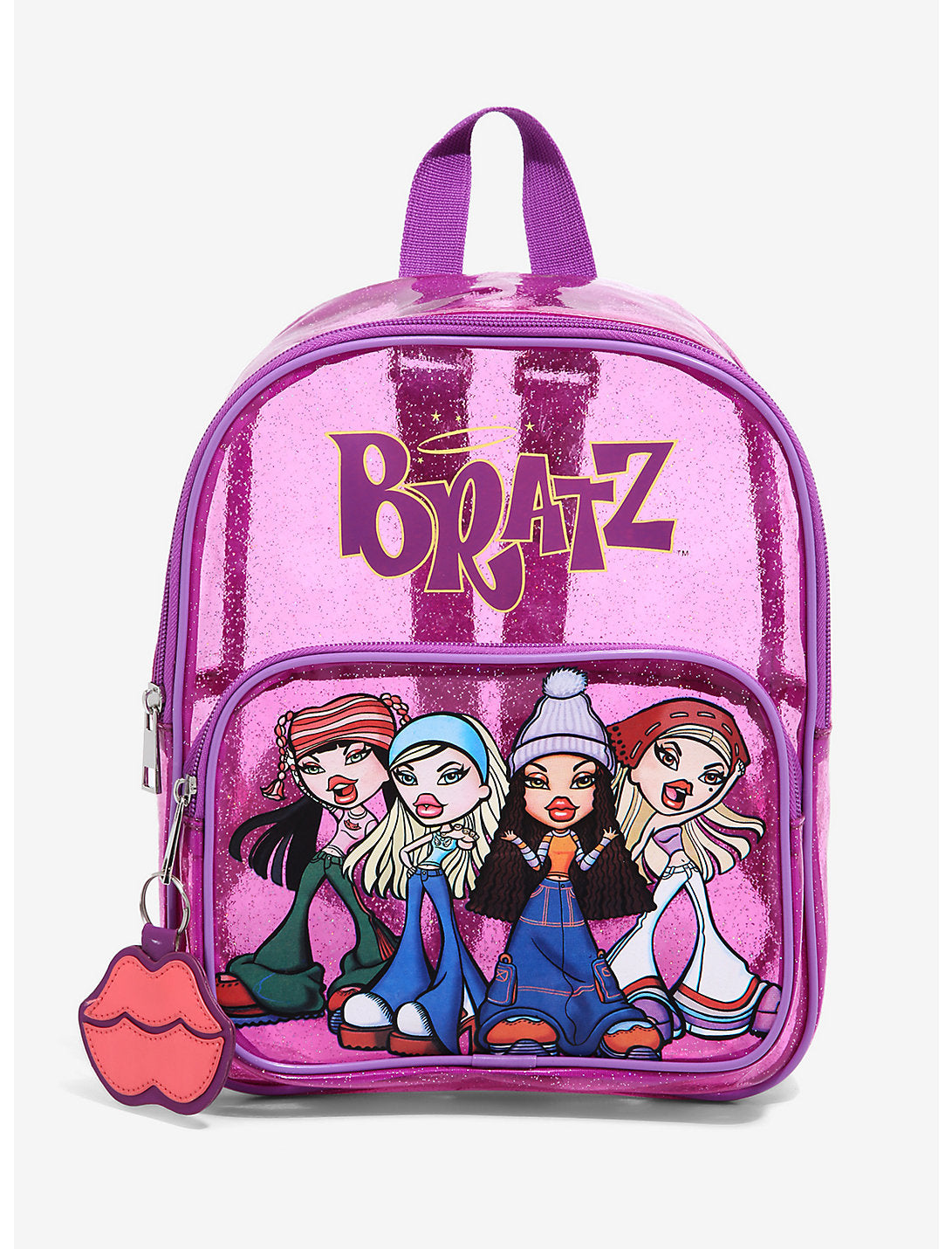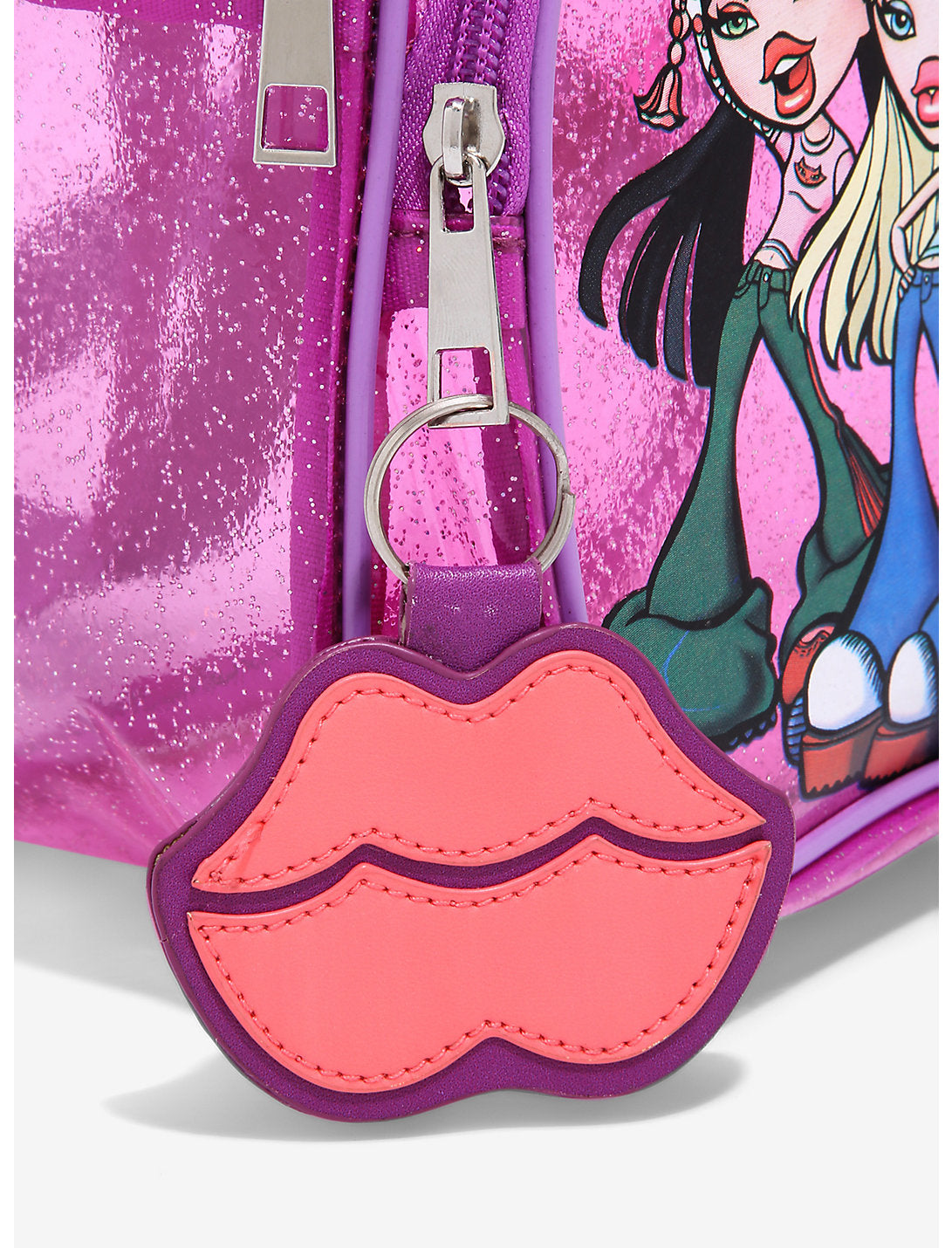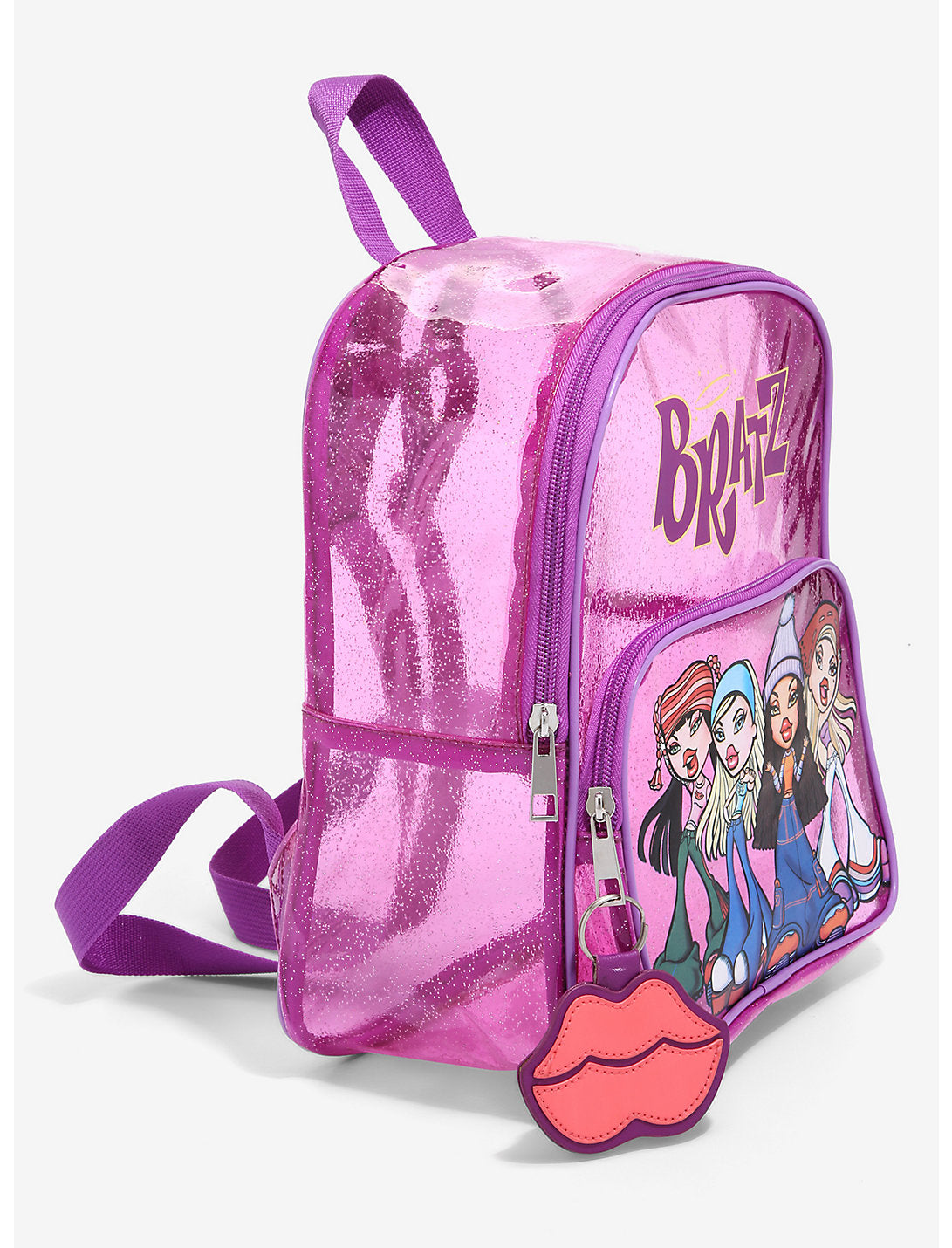 ¡Esta mini mochila transparente con purpurina rosa está aprobada por Bratz! Yasmin, Jade, Cloe y Sasha aparecen en el bolsillo frontal con cremallera y el logo de Bratz está en el compartimento principal. Cuenta con cremalleras y detalles en contraste de color púrpura, un llamativo dije de cremallera en forma de labio.