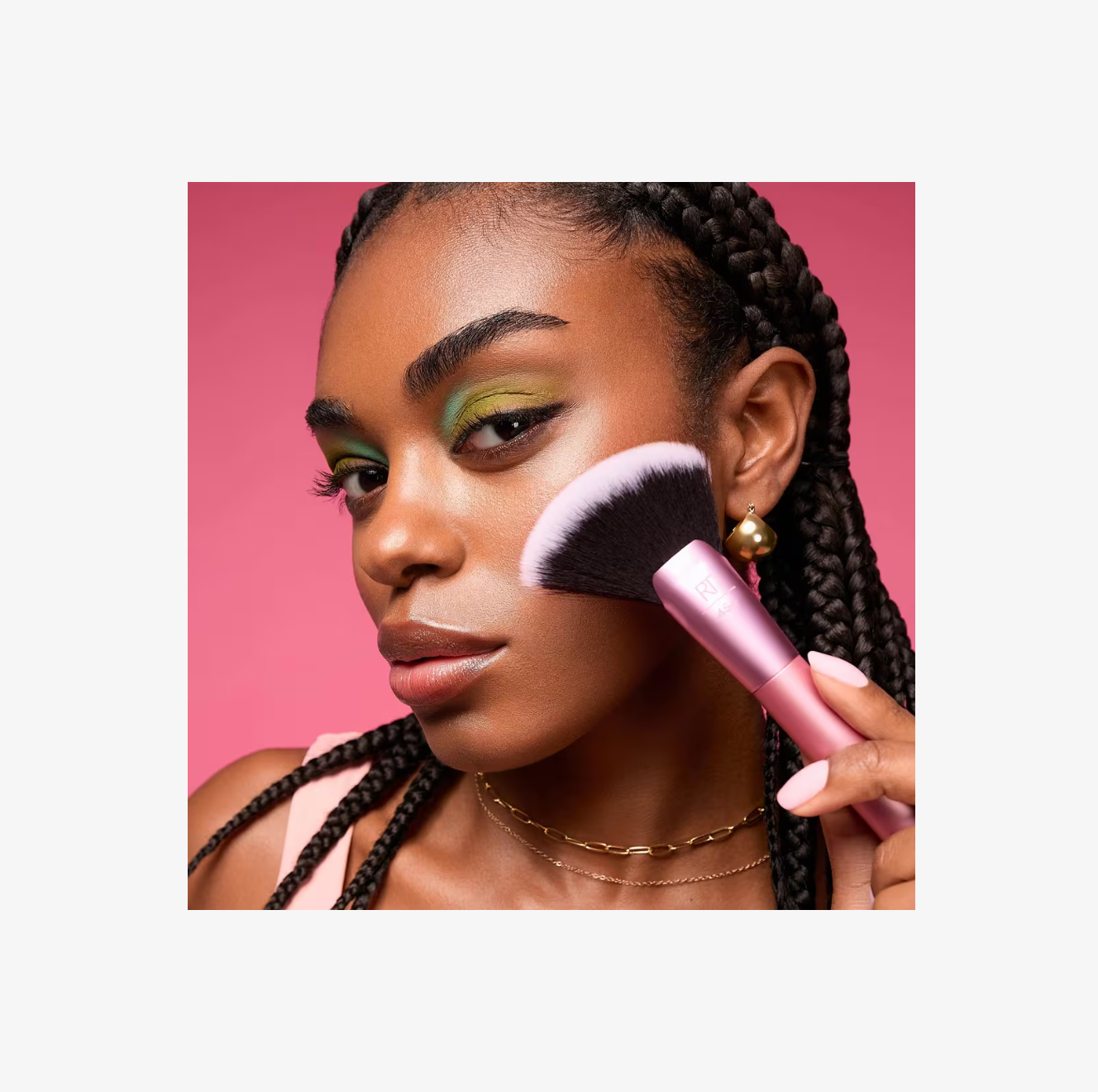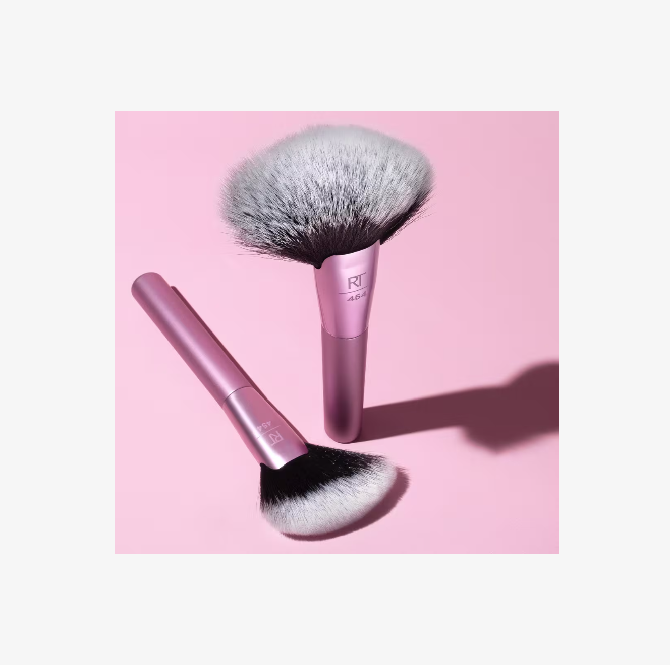 La brocha Extra Big Finishing de Real Techniques tiene una cabeza de abanico extragrande (35% más grande que otras brochas RT) diseñada para aplicar y difuminar polvos de forma rápida y precisa en zonas amplias del rostro.