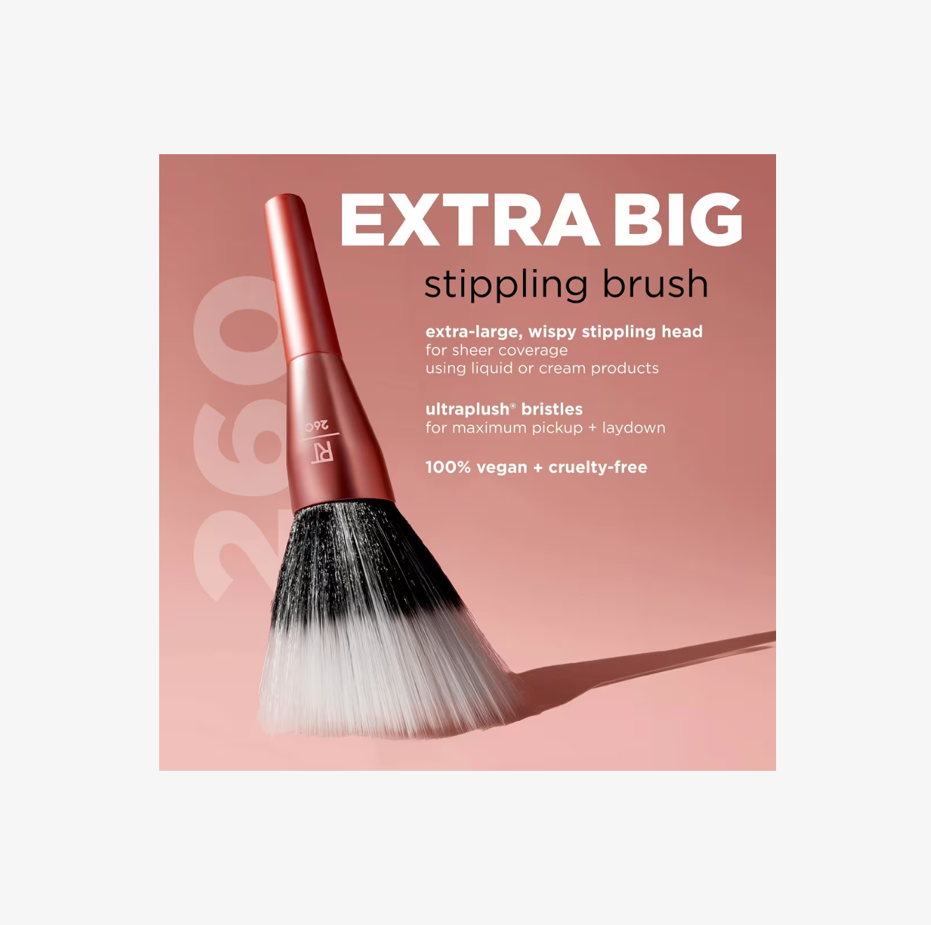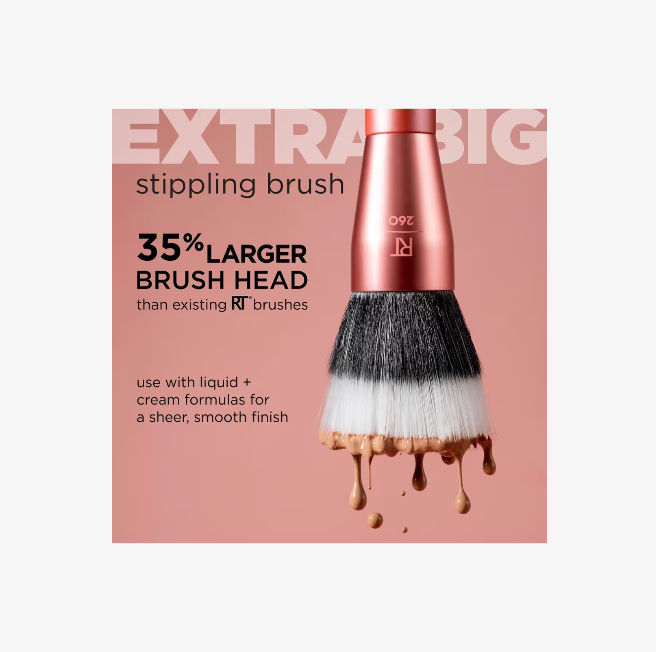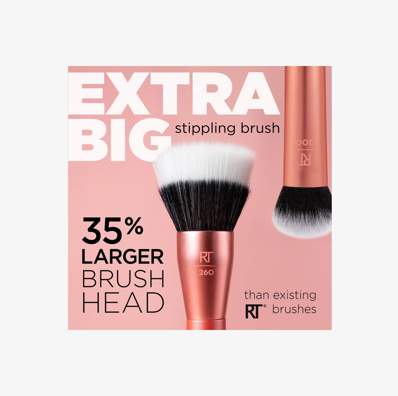 La brocha Extra Grande para Aplicar a Toques de Real Techniques tiene una cabeza grande y esponjosa que es 35% más grande que las cabezas de brochas RT existentes para una cobertura rápida y uniforme.