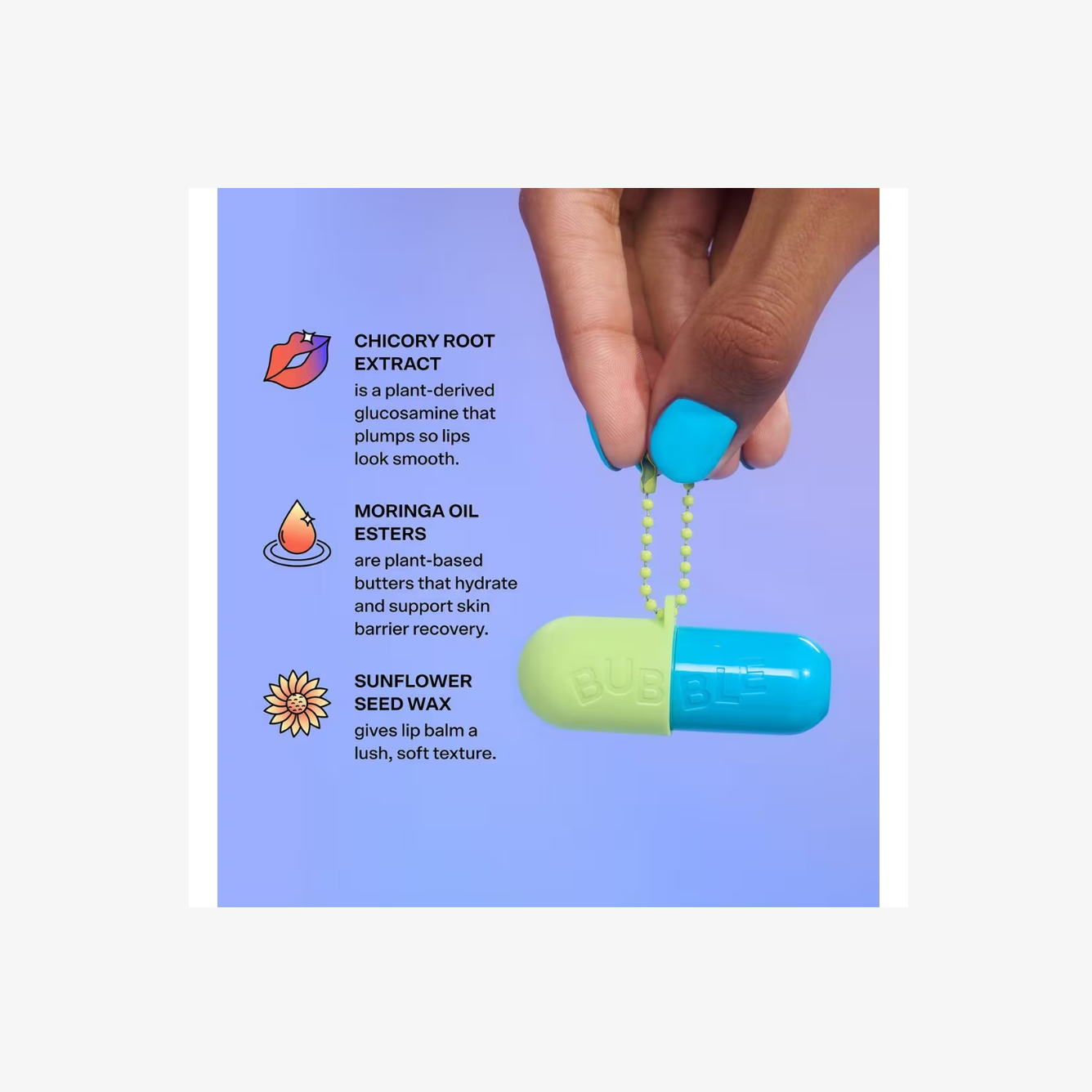 ¡Conoce el mejor secreto de Bubble: Tell All Lip Balm! Este adorable accesorio hidrata y suaviza los labios secos para un look jugoso y con volumen. Su fórmula no pegajosa se absorbe rápido, sin dejar sensación cerosa, y deja los labios suaves y besables. ¡Y nunca lo perderás porque también es un llavero!