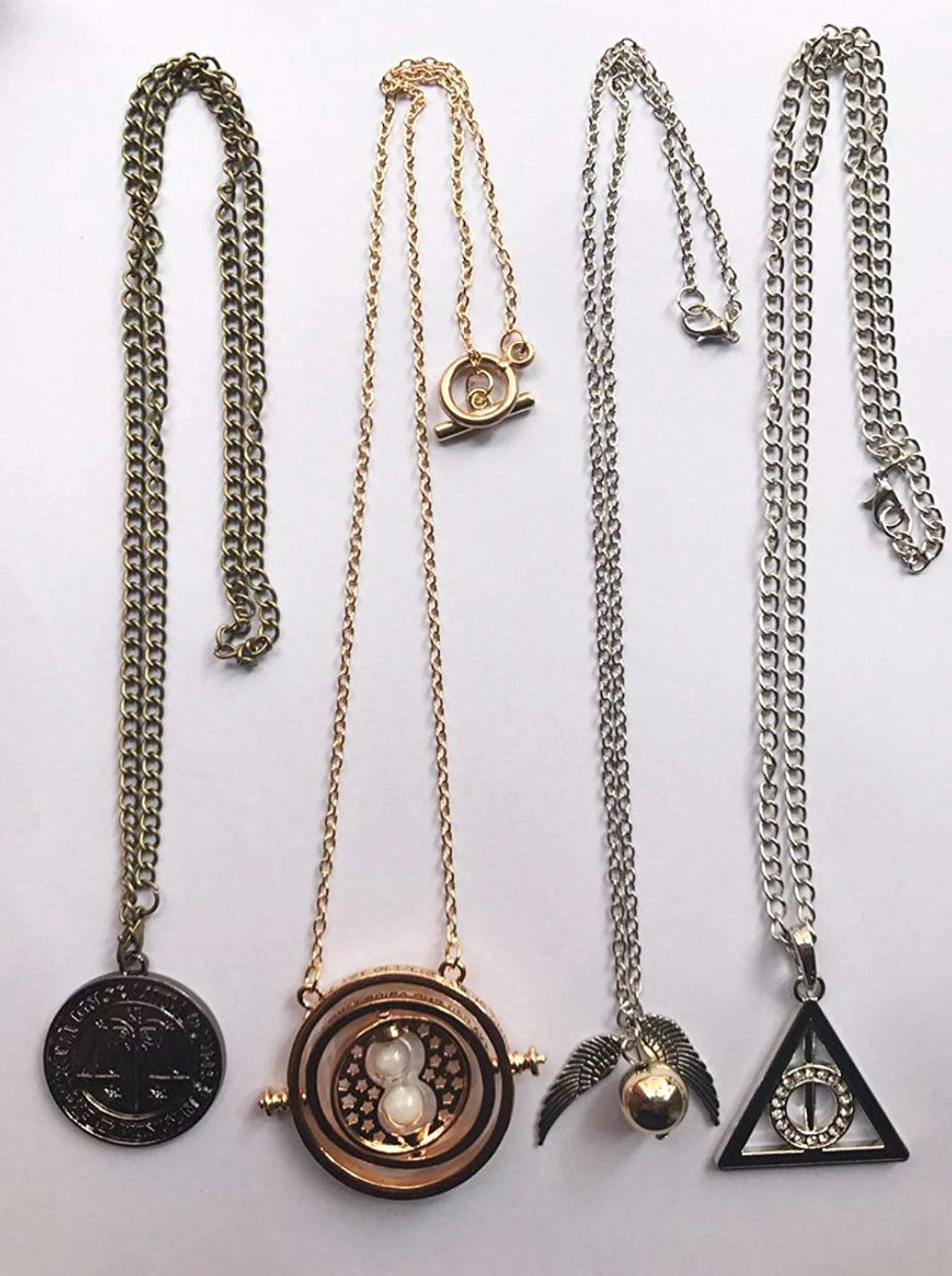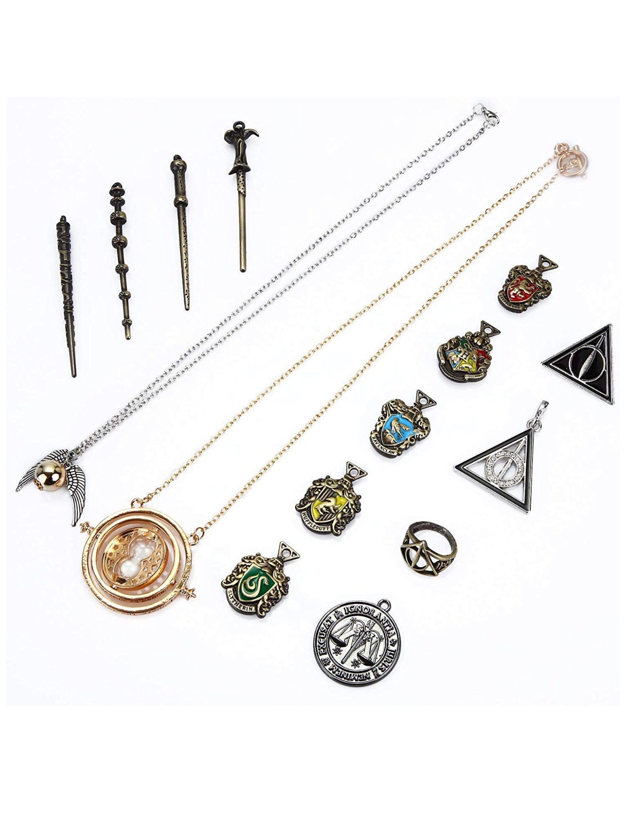 - Incluye: 4 piezas de varita mágica diferente, 5 piezas de insignia, 1 pieza de Golden Snitch, 1 pieza de convertidor de tiempo, 1 pieza de Deathy Hallow, 1 pieza de accesorio de Jurnorantia Juris, 1 llavero, 2 collares