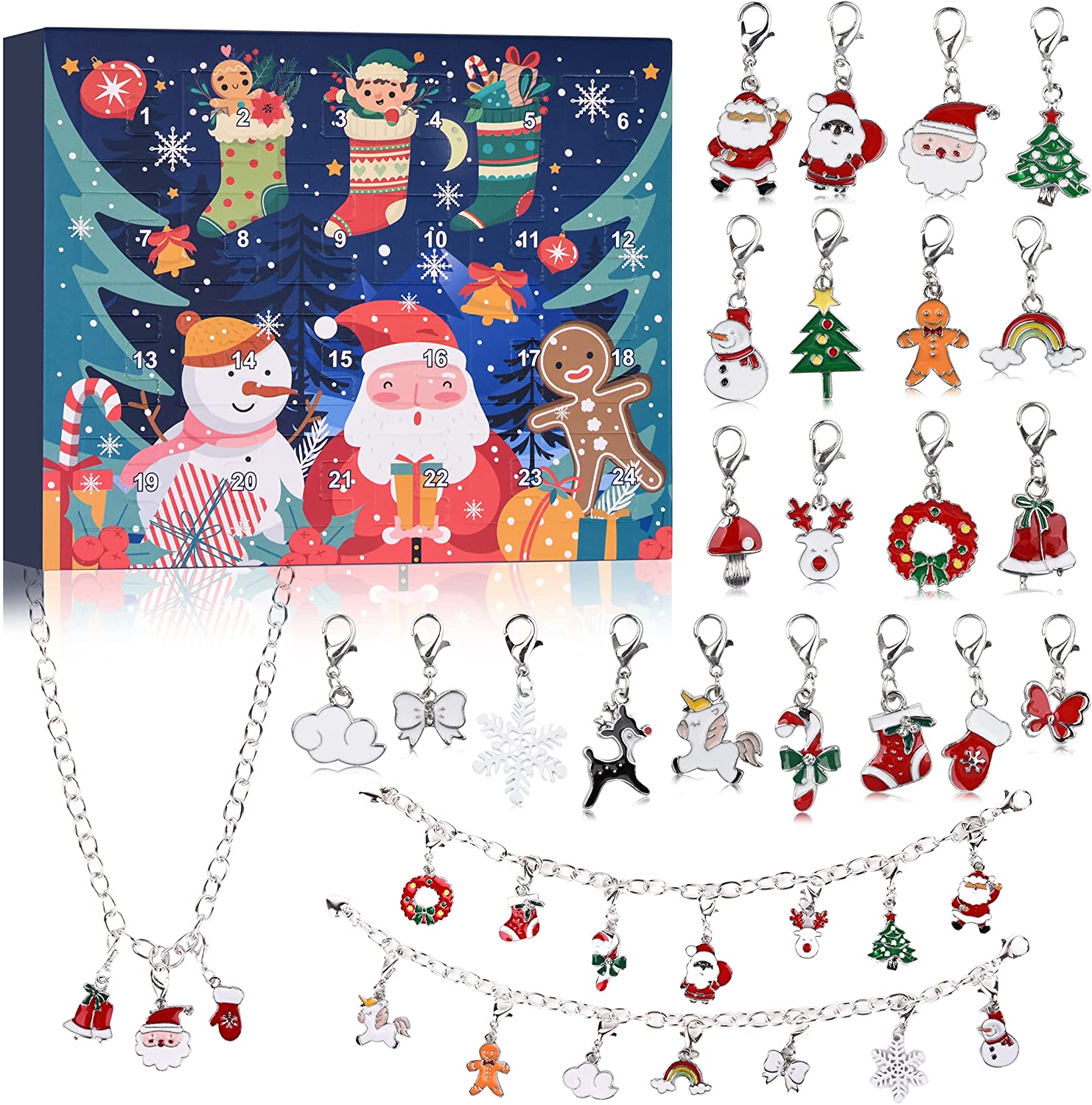 - Características duraderas: cada joya del calendario de adviento de Navidad 2021 está hecha de metal de alta calidad y ha sido estricta inspección de calidad, por lo que no se decolorará ni se decolorará. No es tóxico. Hay un cierre bien hecho entre la pulsera, el collar y los colgantes, que evita que los colgantes se caigan por la pulsera y el collar. Te proporciona una experiencia cómoda.