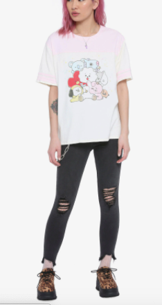 ¡Es hora de una fiesta pastel con tus favoritos de BT21! Impreso en el frente con un diseño de estilo boceto de los personajes y confeti. Con un yugo delantero y trasero de color rosa pastel y rayas aplicadas a juego en las mangas.