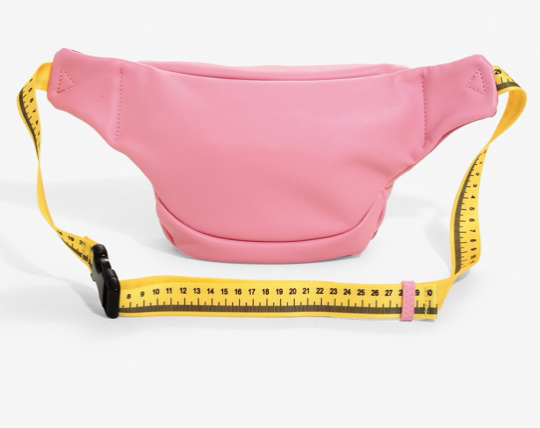 Este cangurera cuenta con herrajes en tono dorado, un compartimento frontal con cremallera, compartimento principal con cremallera, forro interior rosa y una correa ajustable con hebilla inspirada en cinta métrica.