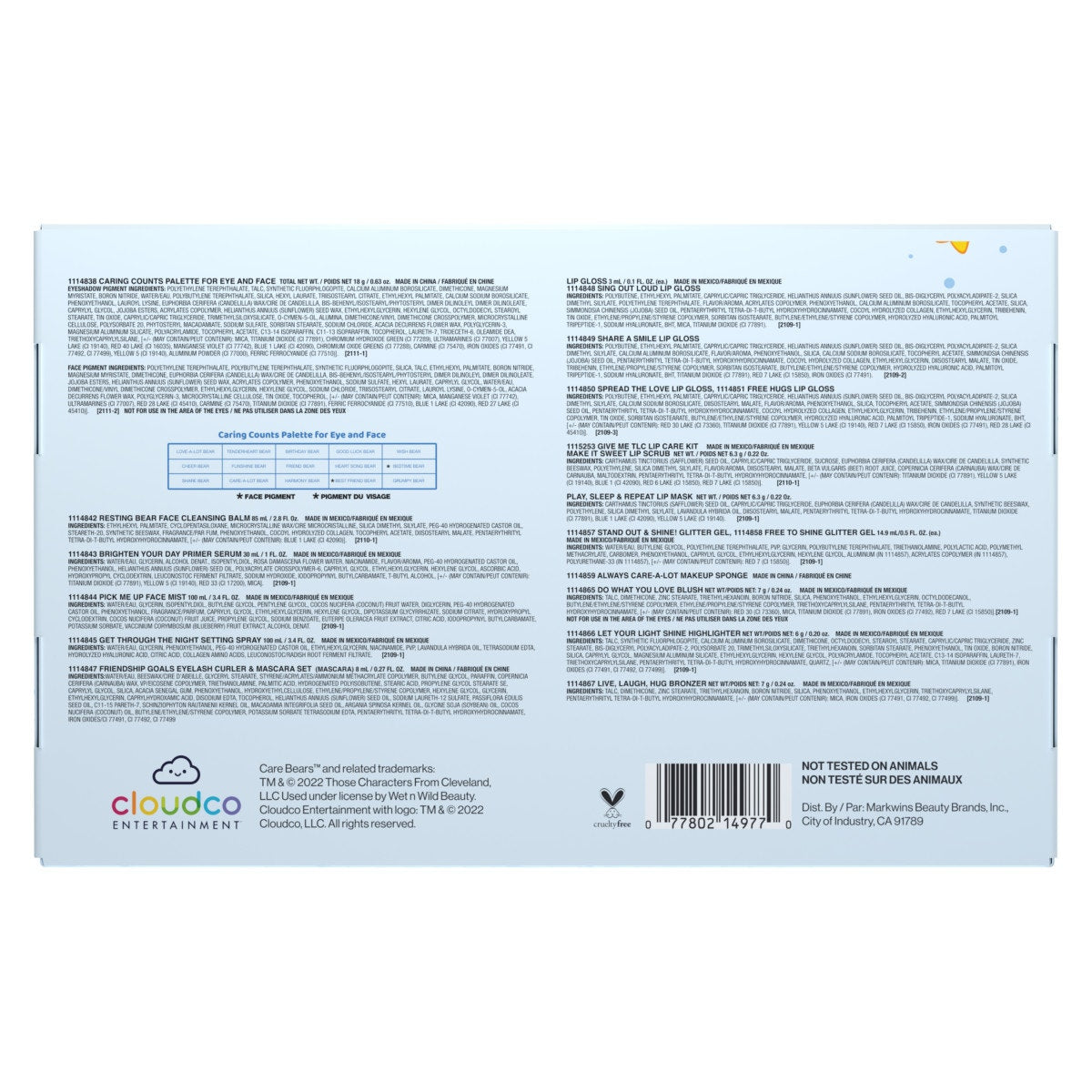 Los artículos en la caja de colección incluyen: Care Bears Caring Counts Eye & Face Palette, Care Bears Cleansing Balm, Care Bears Primer Serum, Care Bears Hydrating Face Mist, Care Bears Setting Spray, Care Bears Eyelash Curler & Mascara Set, Care Bears Shimmer Lip Gloss- Sing Out Loud, Care Bears Shimmer Lip Gloss-Share a Smile, Care Bears Shimmer Lip Gloss-Spread the Love, Care Bears Shimmer Lip Gloss-Free Hugs, Care Bears Lip Scrub, Care Bears Lip Mask, Care Bears Color-Change Makeup Sponge , Care Bears Blush, Care Bears Highlighter, Care Bears Bronzer, Care Bears, Gel con brillantina - ¡Destaca y brilla!, Gel con brillantina - Libre para brillar