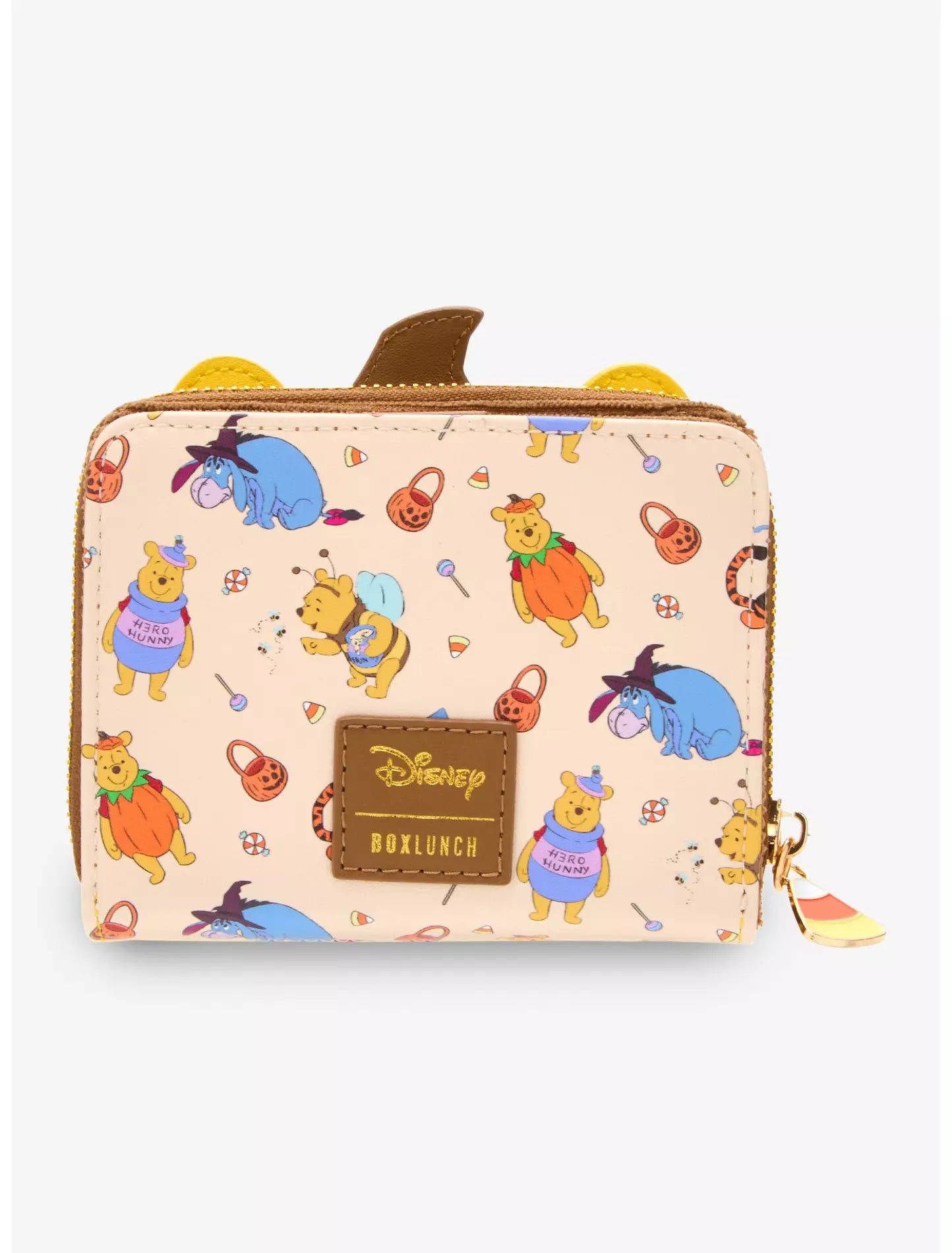 Prepárate para la temporada de otoño con esta cartera de Winnie the Pooh. En el frente, presenta el rostro de Pooh bordado con un aplique de calabaza, mientras que el reverso luce un estampado completo de personajes con disfraces. Cuenta con cierre magnético, bolsillo tipo acordeón, cuatro ranuras para tarjetas, un espacio transparente para ID y un tirador con forma de candy corn.