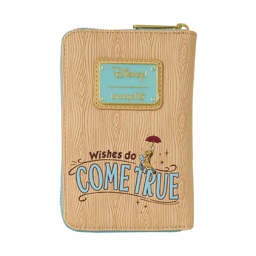 Esta billetera presenta a Pinocho en un marco de camafeo en la parte frontal. En la parte posterior se lee "Los deseos se hacen realidad". El grabado le da una textura y un aspecto similar a la madera. En el interior, hay cuatro ranuras para tarjetas y una ranura transparente para un documento de identidad.