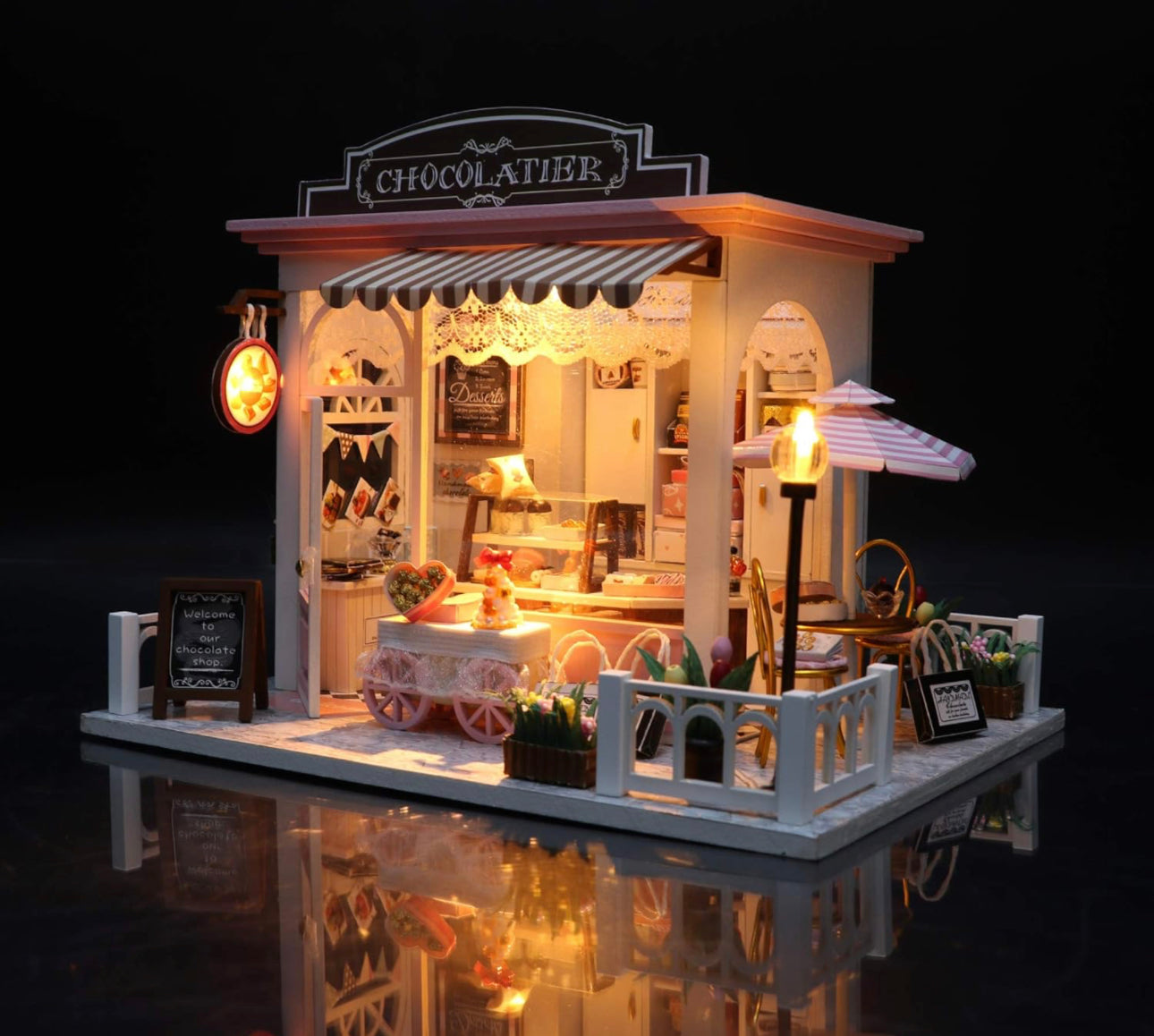 El montaje requiere para todos y cada uno de los muebles, accesorios de corte, construcción y pegado de estructura de madera, cables ligeros, tela y papel impreso, y pegar la cubierta contra el polvo.