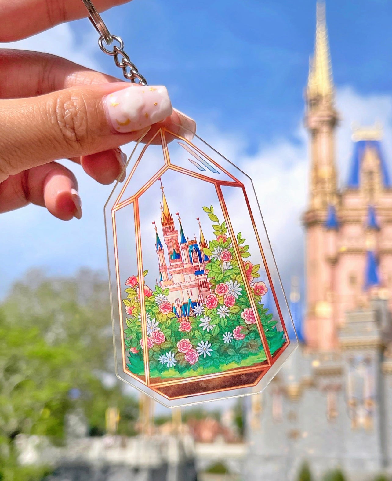 Un castillo mágico escondido dentro de un terrario secreto del jardín. Este llavero acrílico es de doble cara, lo que significa que el lado "frontal" del llavero mostrará el "frente" del castillo, mientras que el lado "trasero" del llavero mostrará la "parte trasera" del castillo, imitando como si estuviera en un terrario plantado de vidrio real.