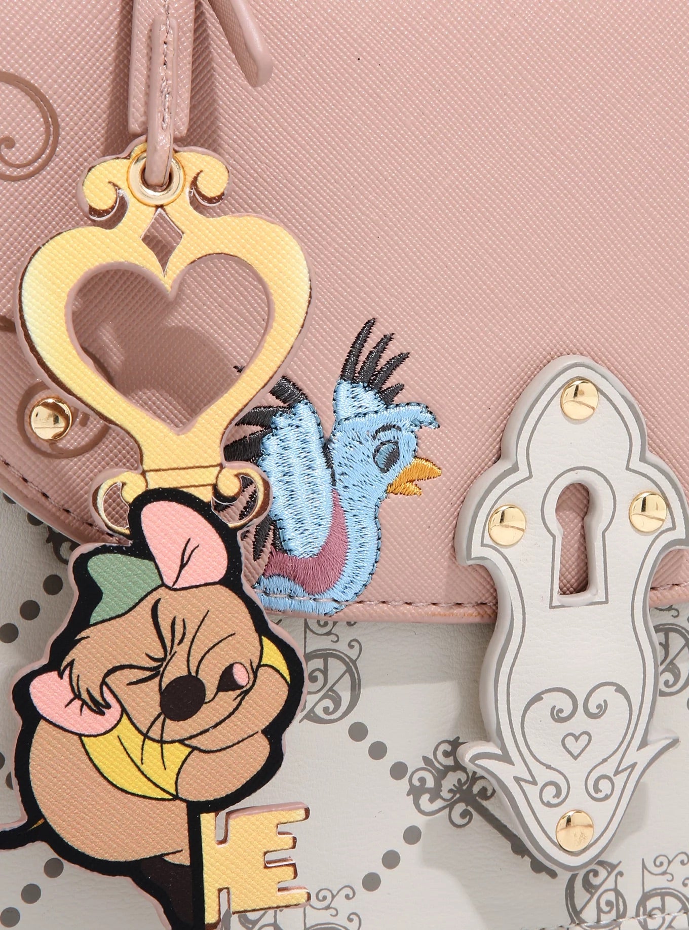 ¡Qué hermoso sueño hecho realidad! Con reminiscencias del vestido rosa que le hicieron las amigas de Cenicienta, este bolso de piel sintética de ensueño de Danielle Nicole presenta un esquema de color rosa y crema, diseño de monograma grabado, pájaros bordados, un amuleto recortado de Gus y una llave en forma de corazón, y oro. tono de hardware de metal.