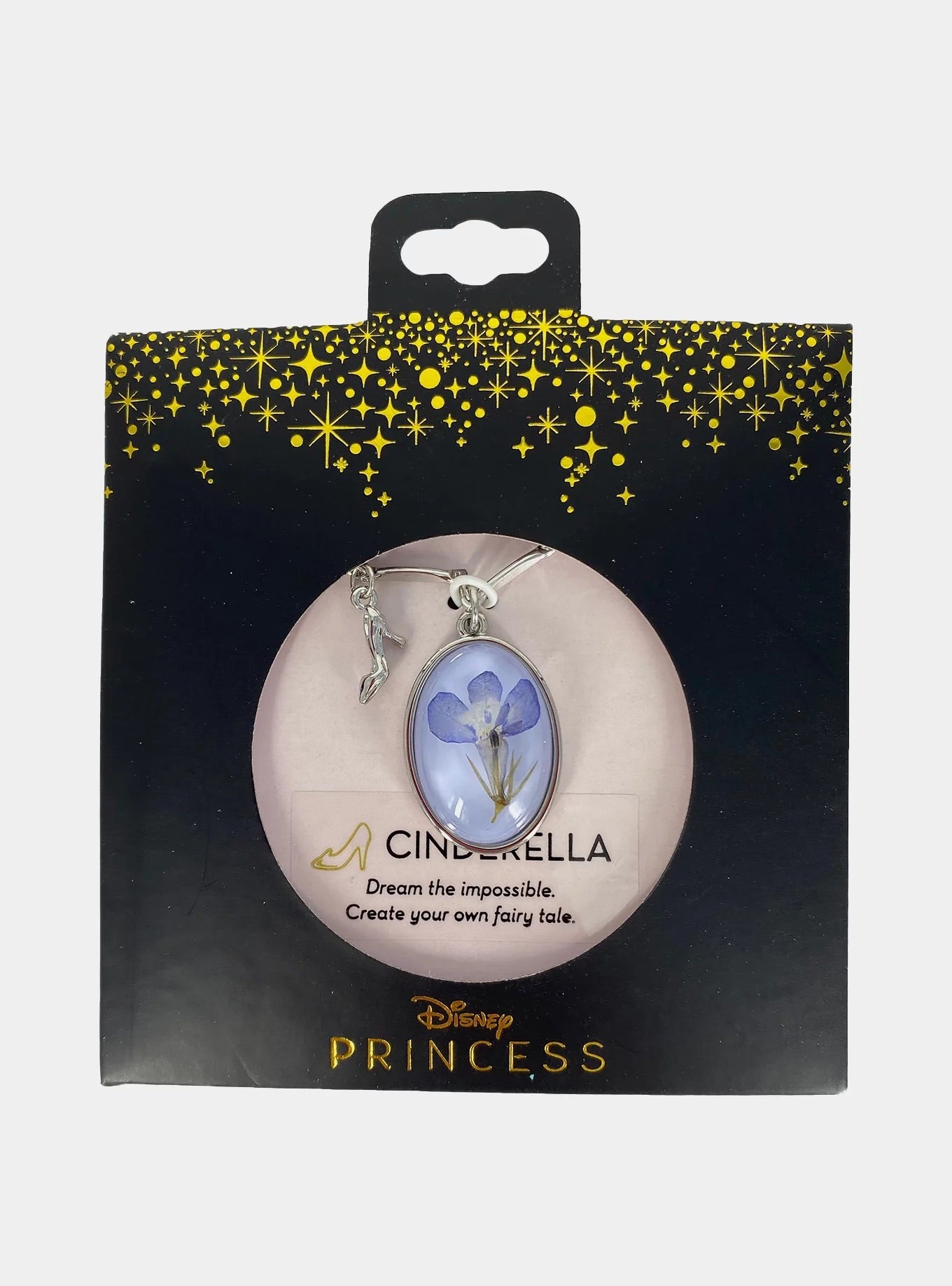 Sueña lo imposible. Crea tu propio cuento de hadas. Representa a tu princesa de Disney favorita, Cenicienta. Este collar plateado presenta un colgante de flor azul seca con un dije de zapatilla de cristal plateado.