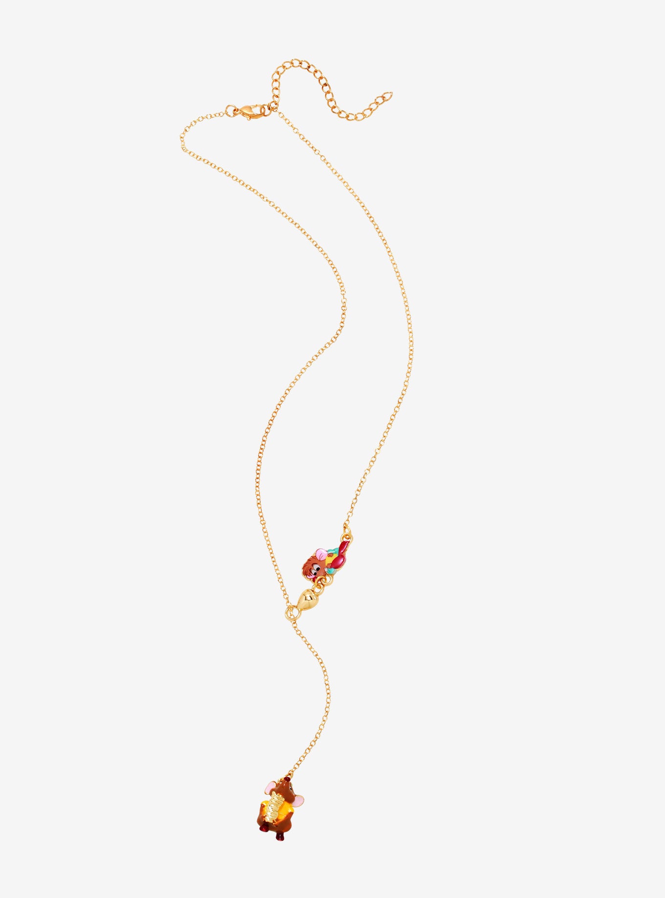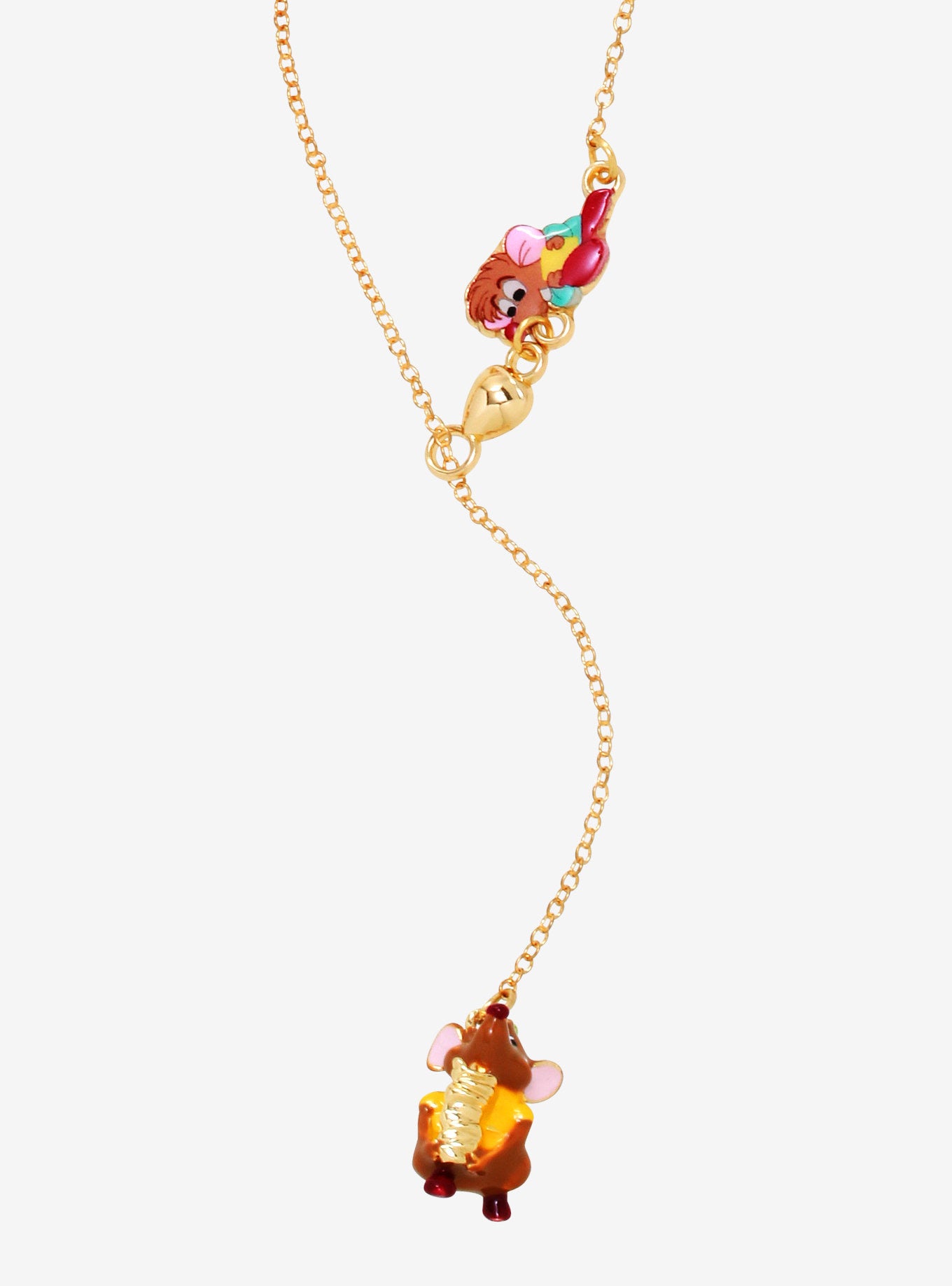 ¡Mantén a Gus y Jaq a salvo de Lucifer el gato llevándolos contigo en este collar de Cenicienta! Los dos ratones aparecen como amuletos en este collar ajustable en tono dorado, con Gus tratando de llevar tantos granos de maíz como puede y Jaq tratando de llamar la atención de su amigo.