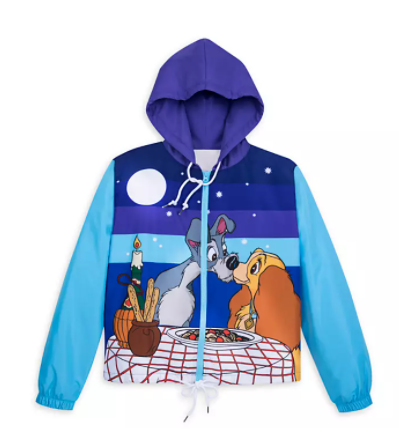 Dale un mordisco a una ventosa "Bella Notte" con esta clásica chaqueta cortavientos ilustrada con el arte a todo color de La dama y el vagabundo cenando al aire libre en Tony's. Ayudará a mantener la atmósfera cálida y prometedora.