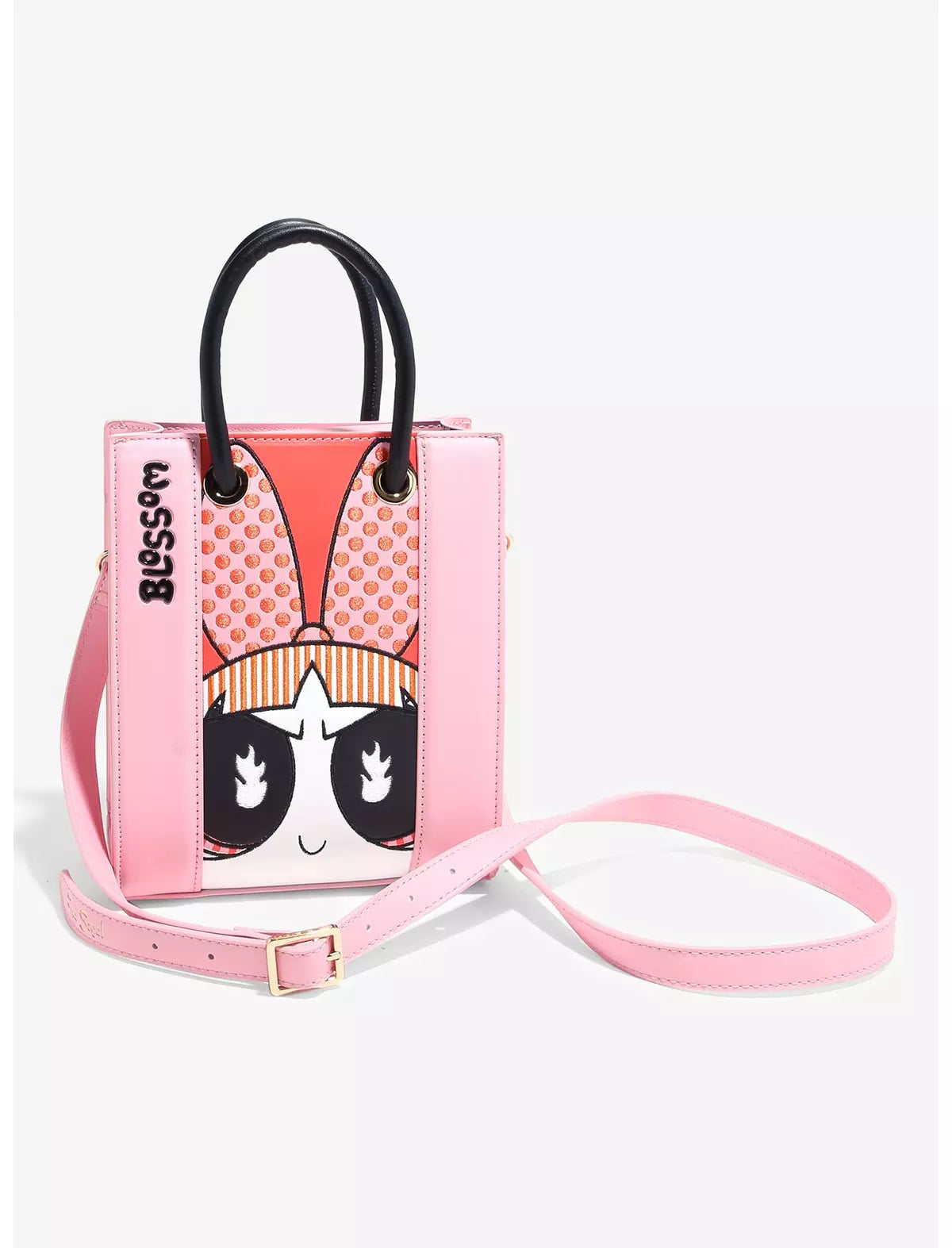 ¡Serás azúcar, especias y todo lo bueno con esta bandolera de Las Chicas Superpoderosas! Este bolso inspirado en Blossom presenta el nombre, la cara y el lazo característico de la heroína, con lunares bordados y detalles impresos. Las elegantes asas negras facilitan el agarre, o utiliza la correa cruzada extraíble para tener las manos libres mientras luchas contra el crimen.