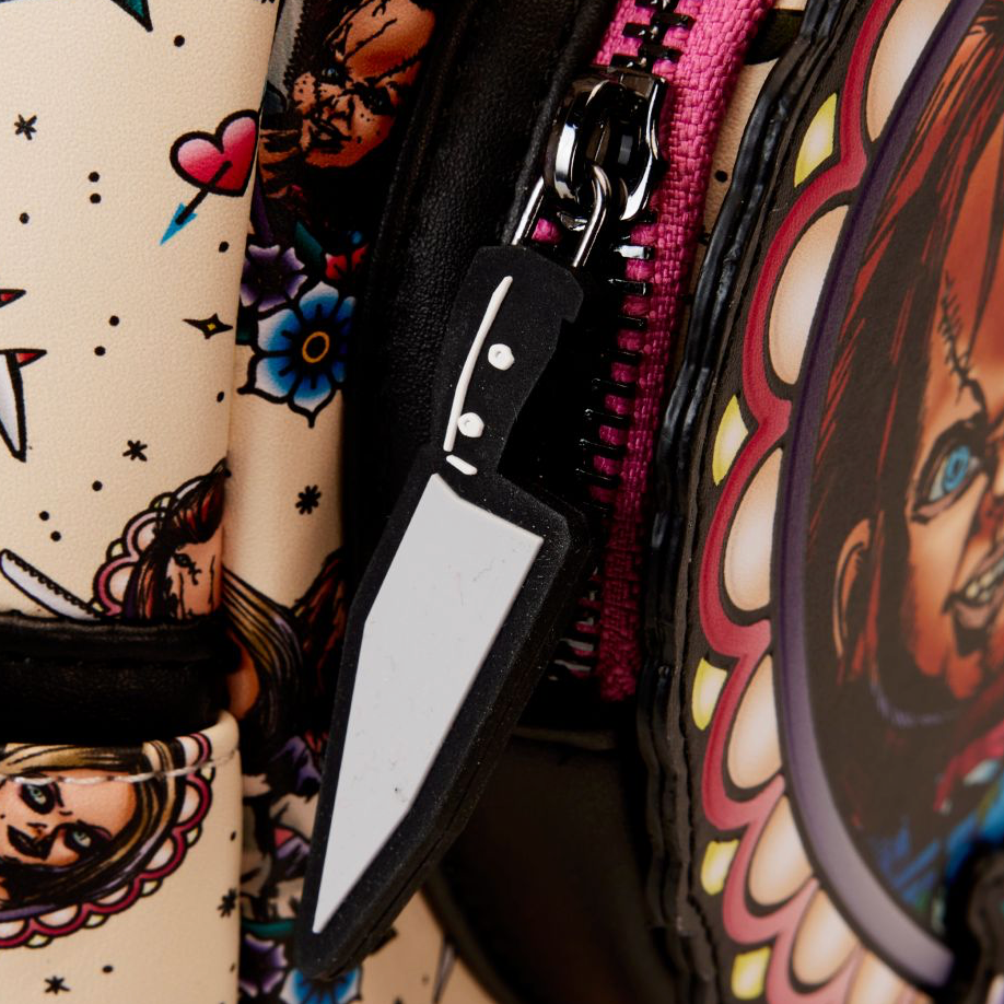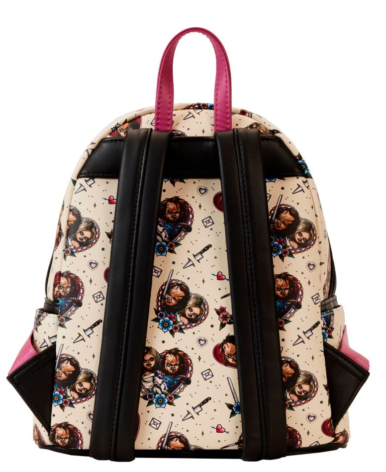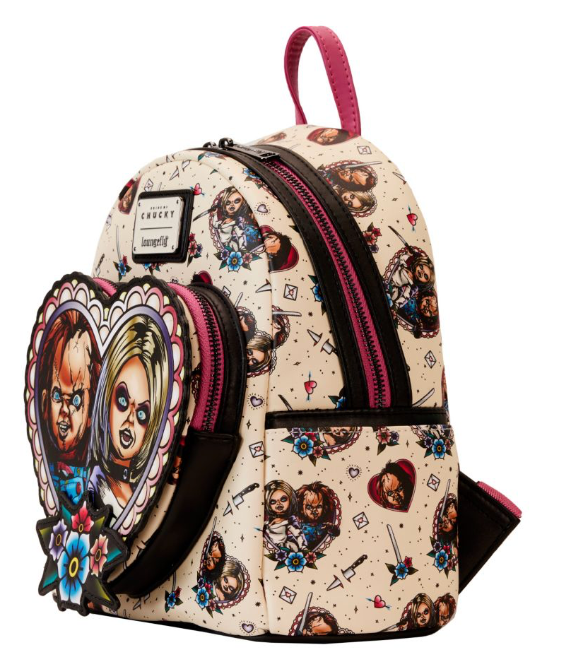 ¡Muestra a tu pareja favorita de películas de terror con esta divertida mini mochila Chucky y Tiffany Bride of Chucky! Esta pequeña mochila tiene mucho espacio para tu equipo y es perfecta para el día o la noche.