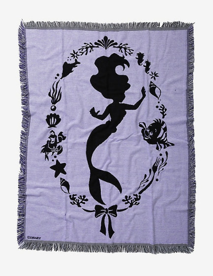 Manten tus aletas cálidas y acogedoras con esta manta inspirada en La Sirenita. Con un diseño gris y lila con la silueta de Ariel dentro de un marco de temática marina.