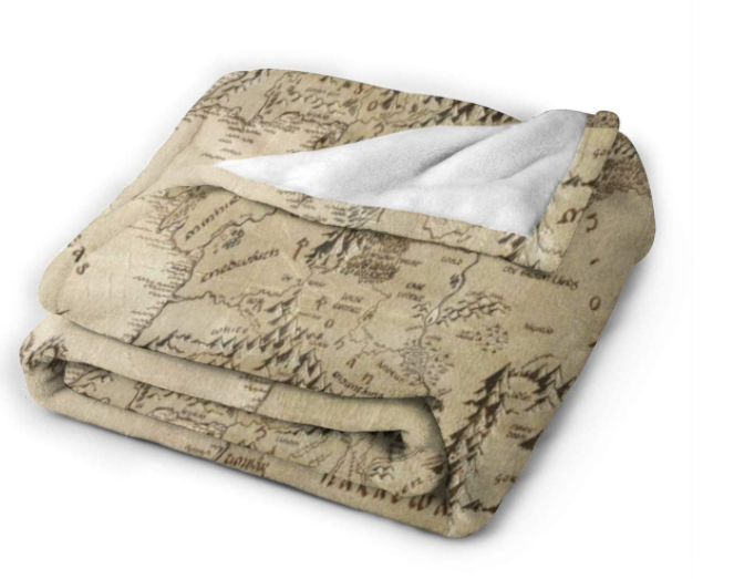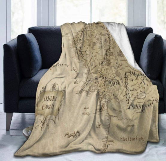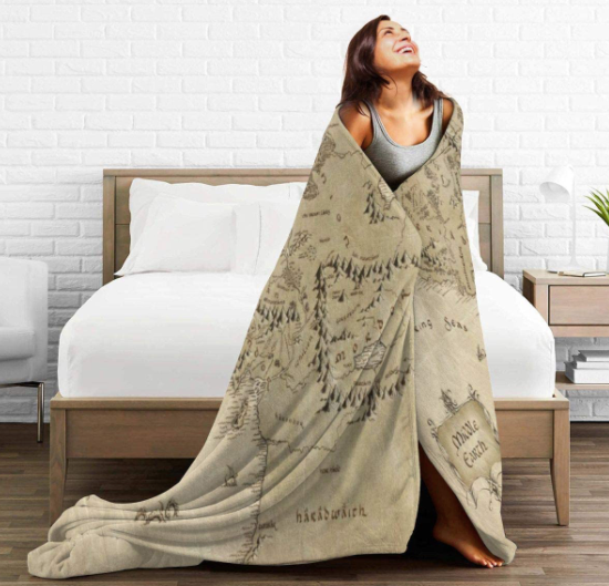 Esta manta de estilo tapiz presenta un mapa de la Tierra Media.