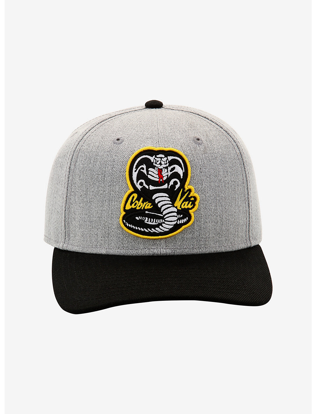 ¡Cobra Kai nunca muere! Representa a tu dojo con esta gorra snapback gris y negra. Hay un parche con el logo de Cobra Kai bordado en la parte delantera y "No mercy" bordado en blanco en la parte trasera.