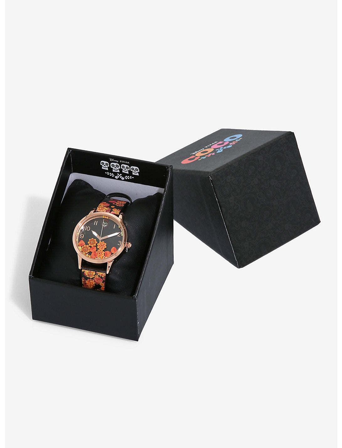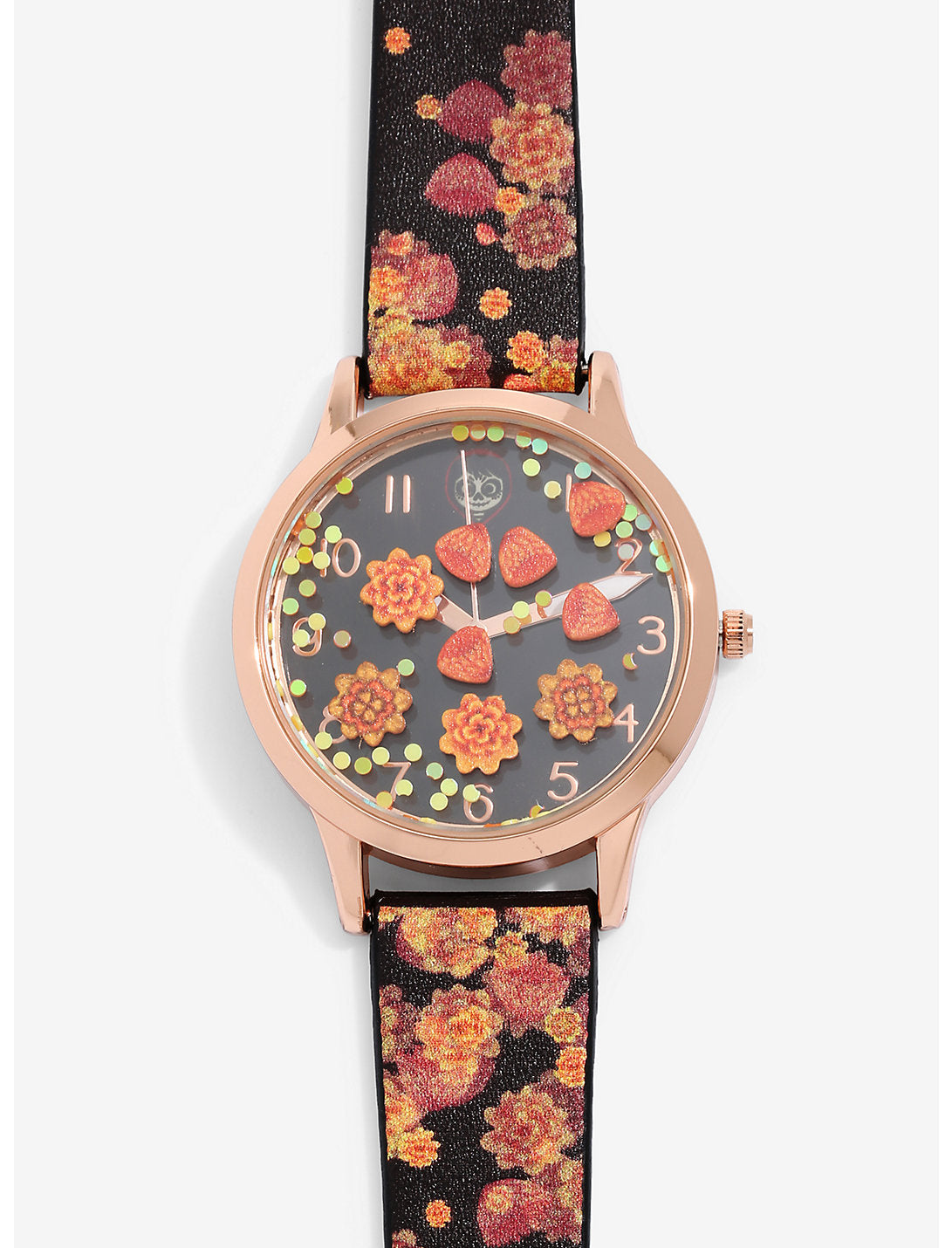 ¡Cualquier momento es el momento del espectáculo cuando llevas este hermoso reloj inspirado en Coco de Disney • Pixar! Decorado con caléndula en la correa y en la esfera (¡flotan!), Este llamativo reloj a Miguel con su maquillaje de Día de Muertos en lugar del 12. ¡Abróchelo, suelte su mejor grito y vaya un poco loco!