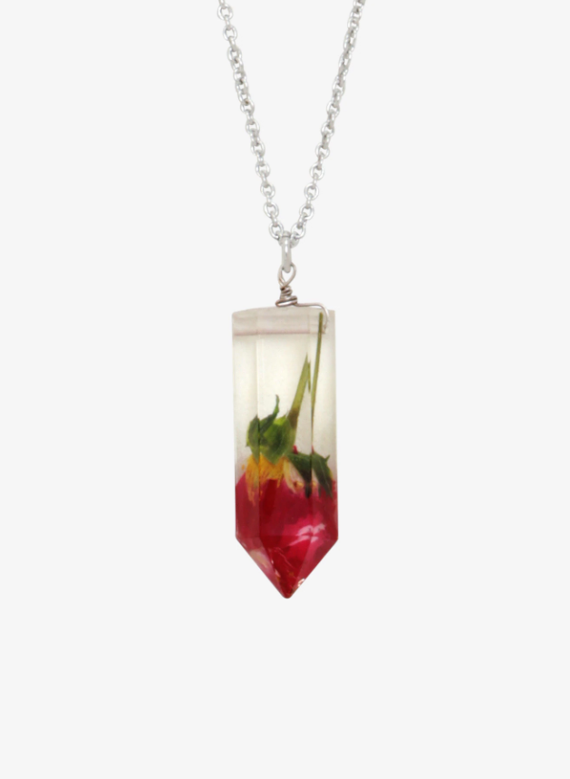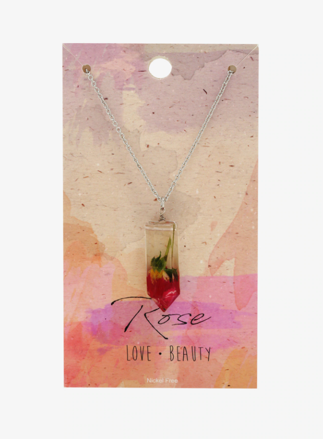 ¡Lleva amor y belleza alrededor de tu cuello con este collar! Con una rosa seca envuelta en un cristal transparente.