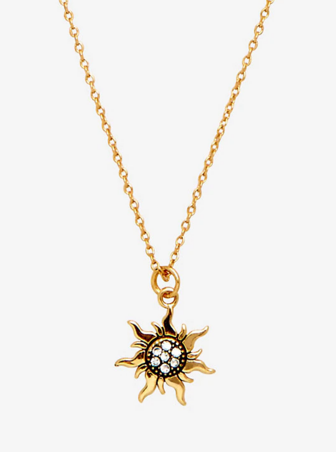 Lleva un poco de magia todos los dias contigo con la ayuda de Rapunzel. Este collar de tono dorado delicado cuenta con un brillante sol
