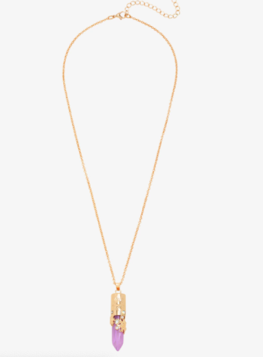 ¡Rapunzel de Enredados se convirtió en un collar de cristal, creemos que se vería así! La cadena de tono dorado presenta un falso cristal púrpura con una carcasa de tono dorado, con el símbolo del sol y gemas brillantes.
