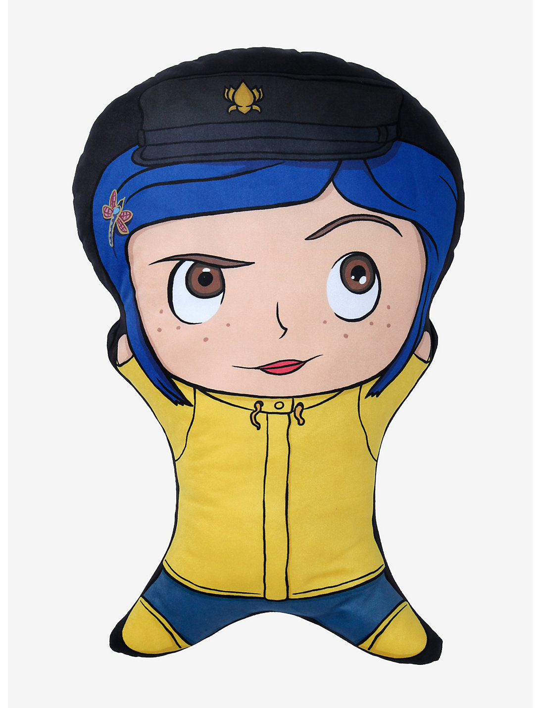 - ¿Listo para una noche de cine? ¡Coraline lo es! Esta almohada figurativa presenta a Coraline con su impermeable amarillo y su sombrero negro.