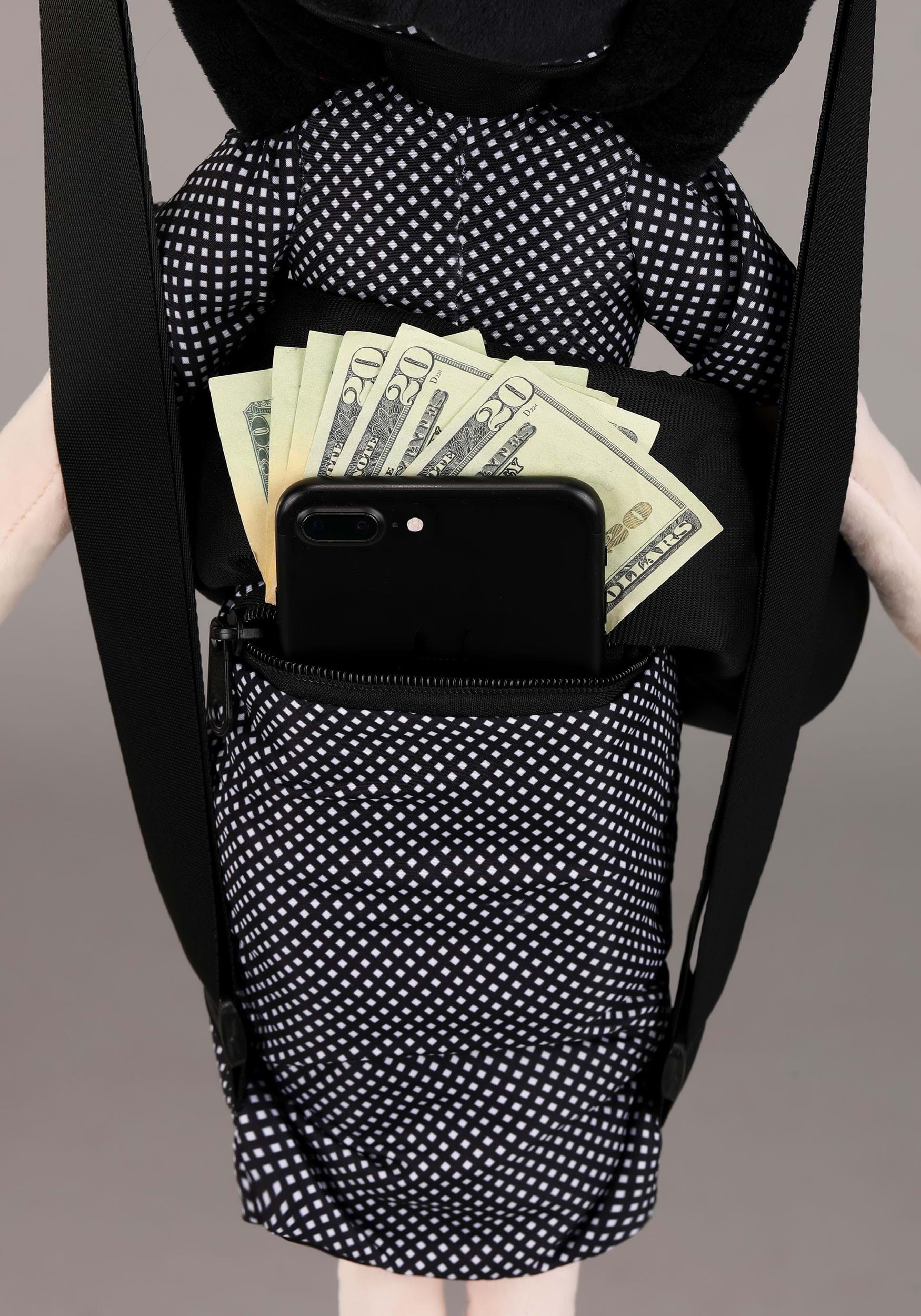 La cremallera en la parte posterior se abre a un pequeño compartimento para un teléfono pequeño o una billetera.