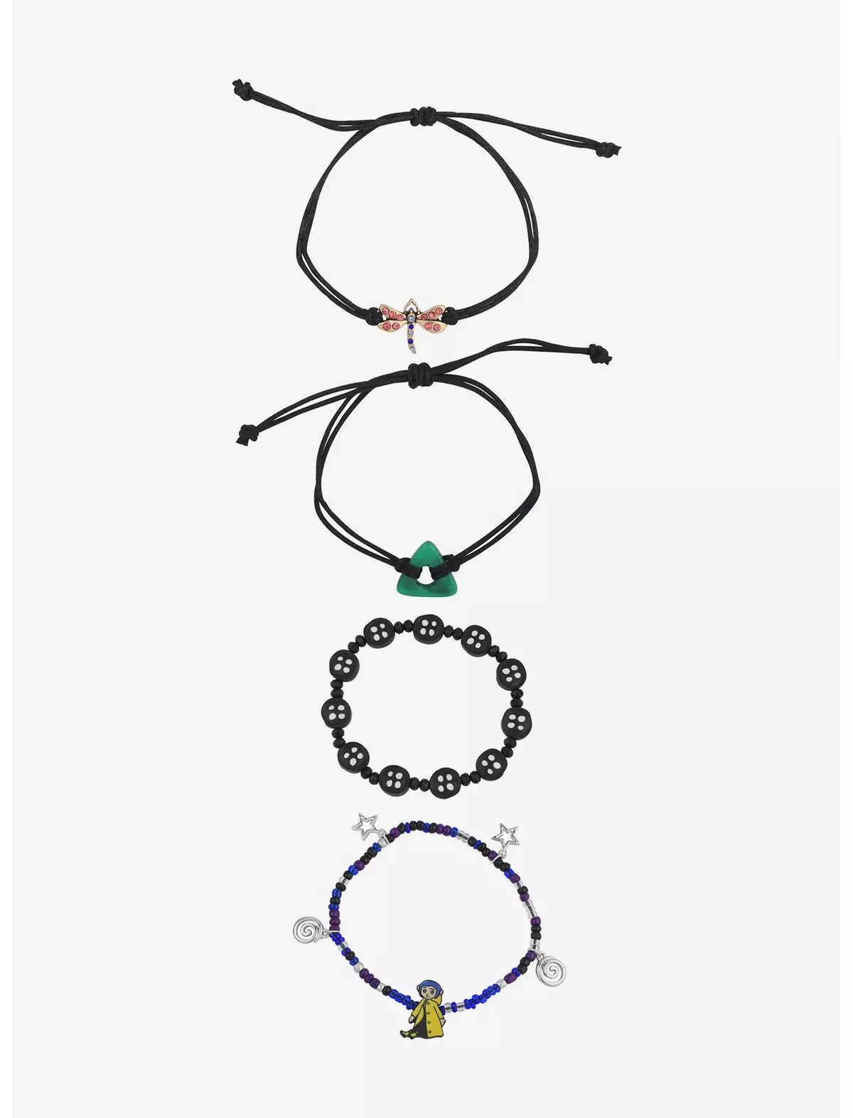 Canaliza todo lo relacionado con Coraline con este juego de pulseras que presenta diferentes símbolos de la película. Hay dos pulseras de cordón, una con un dije de piedra que mira y otra con un dije de libélula con joyas inspirado en su pinza para el cabello. Hay una pulsera de cuentas decorada con botones y otra con un charm de Coraline como muñeca.