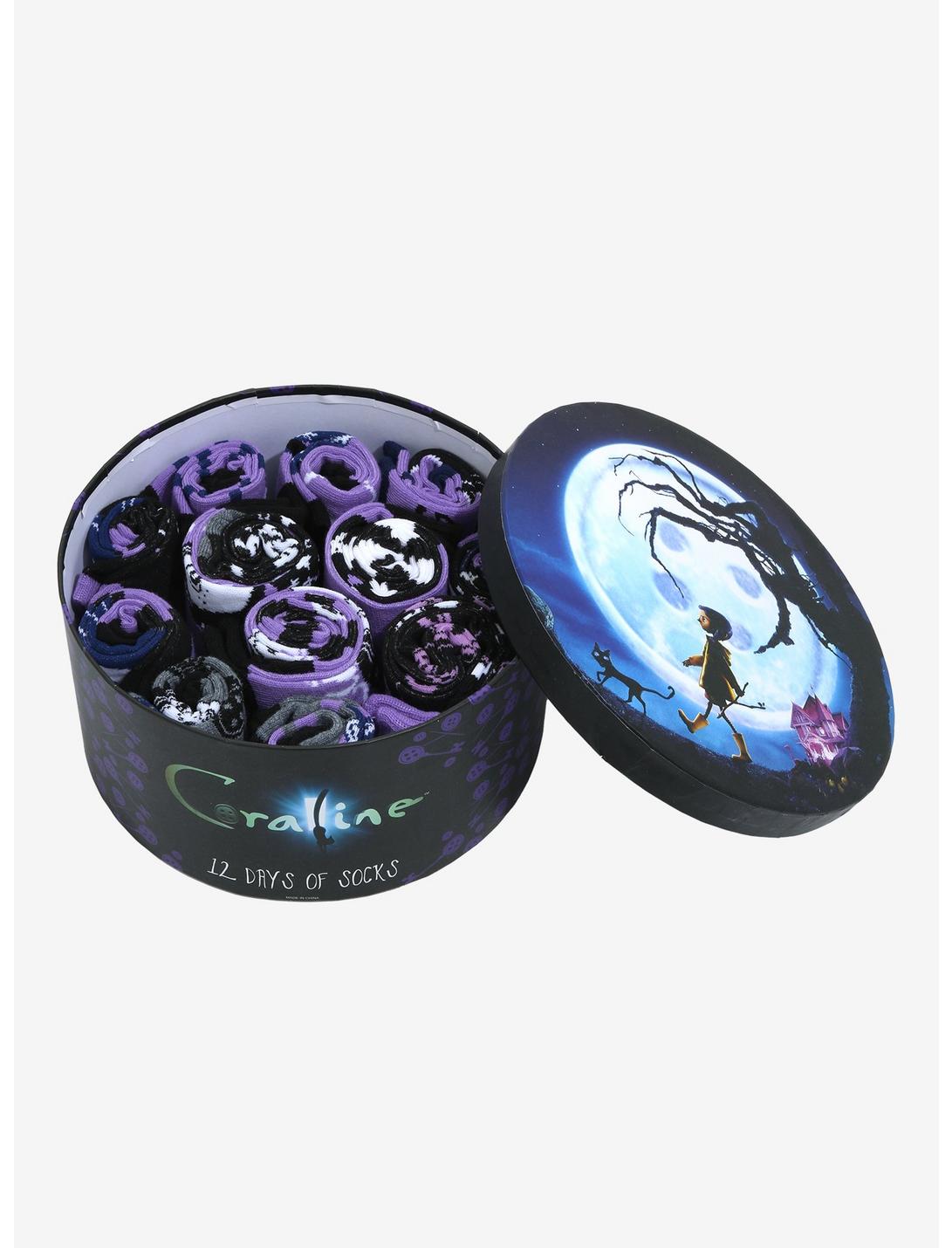 Te espera un regalo de Otra Madre: ¡este par de calcetines Coraline! Ya sea que vaya al espectáculo de circo de Bobinsky o huya de Beldam, este par de calcetines es perfecto para cualquier ocasión. Cuenta con 8 pares de calcetines tobilleros y 4 pares de calcetines largos, todos con diseños en tonos morados de Coraline y otros íconos de la película. ¡Viene en una caja de regalo circular!