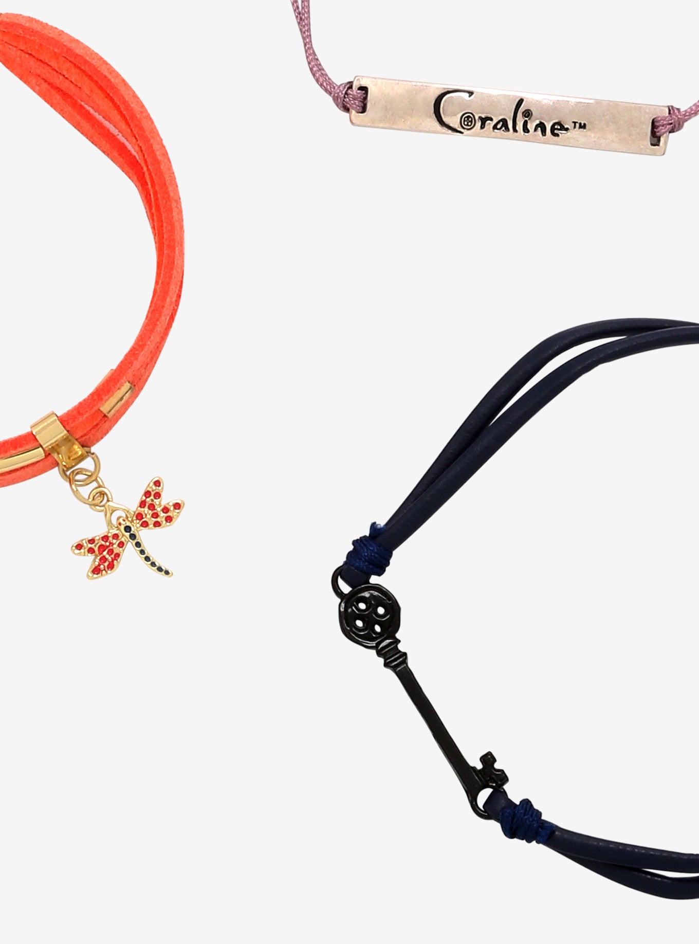 Luce tan lindo como un botón con este juego de Coraline que incluye una pulsera de cordón de melocotón con dije de libélula, una pulsera de cordón de lavanda con colgante con el logo de Coraline y una pulsera de cordón azul marino con dije de llave.