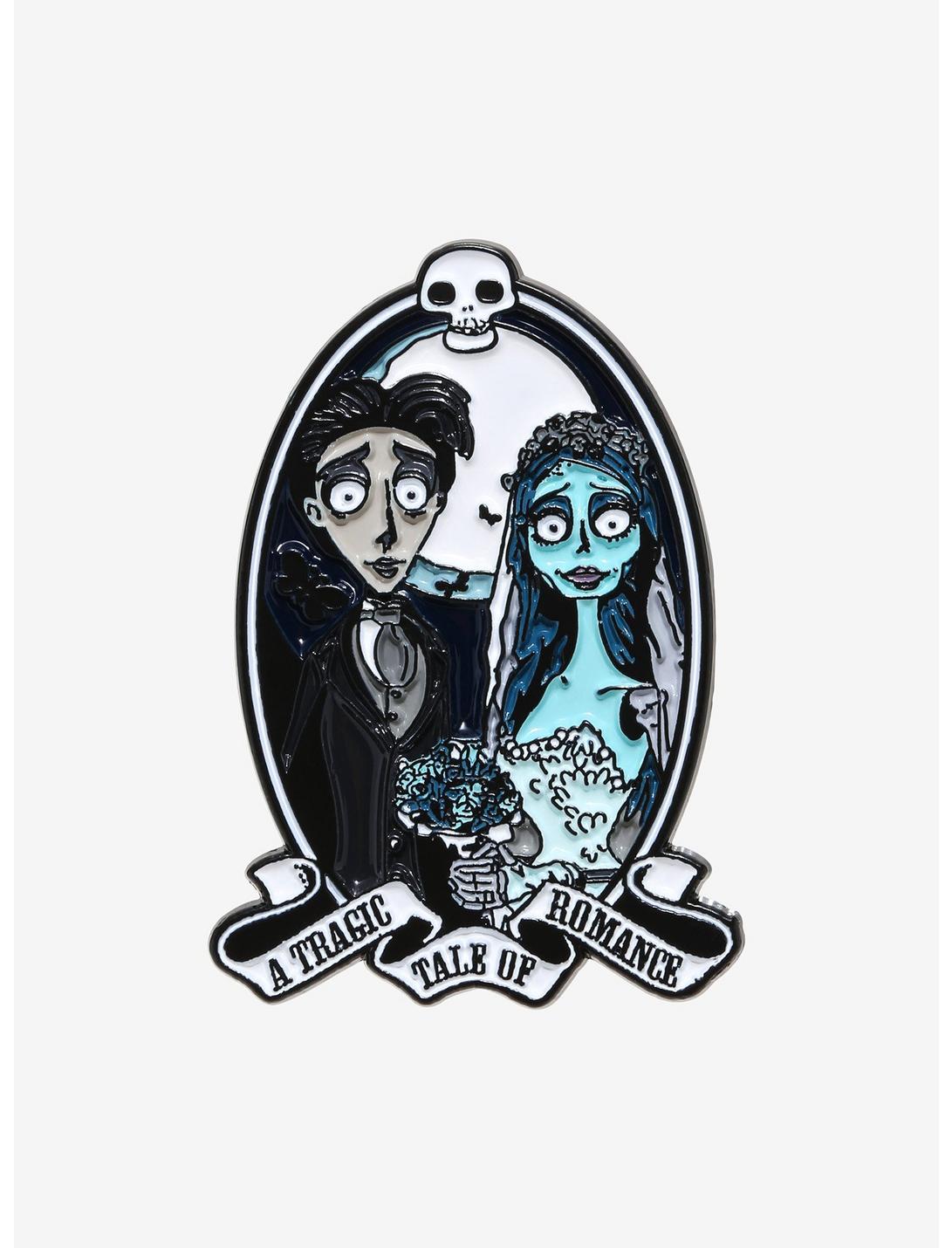 Con esta mano... ¡colocaremos este pin en nuestros bolsos y chaquetas! ¡Representa a la Tierra de los Muertos y a los vivos con este pin esmaltado de Corpse Bride! Presenta un retrato de Víctor y Emily con "Una trágica historia de romance" en un cartel debajo.