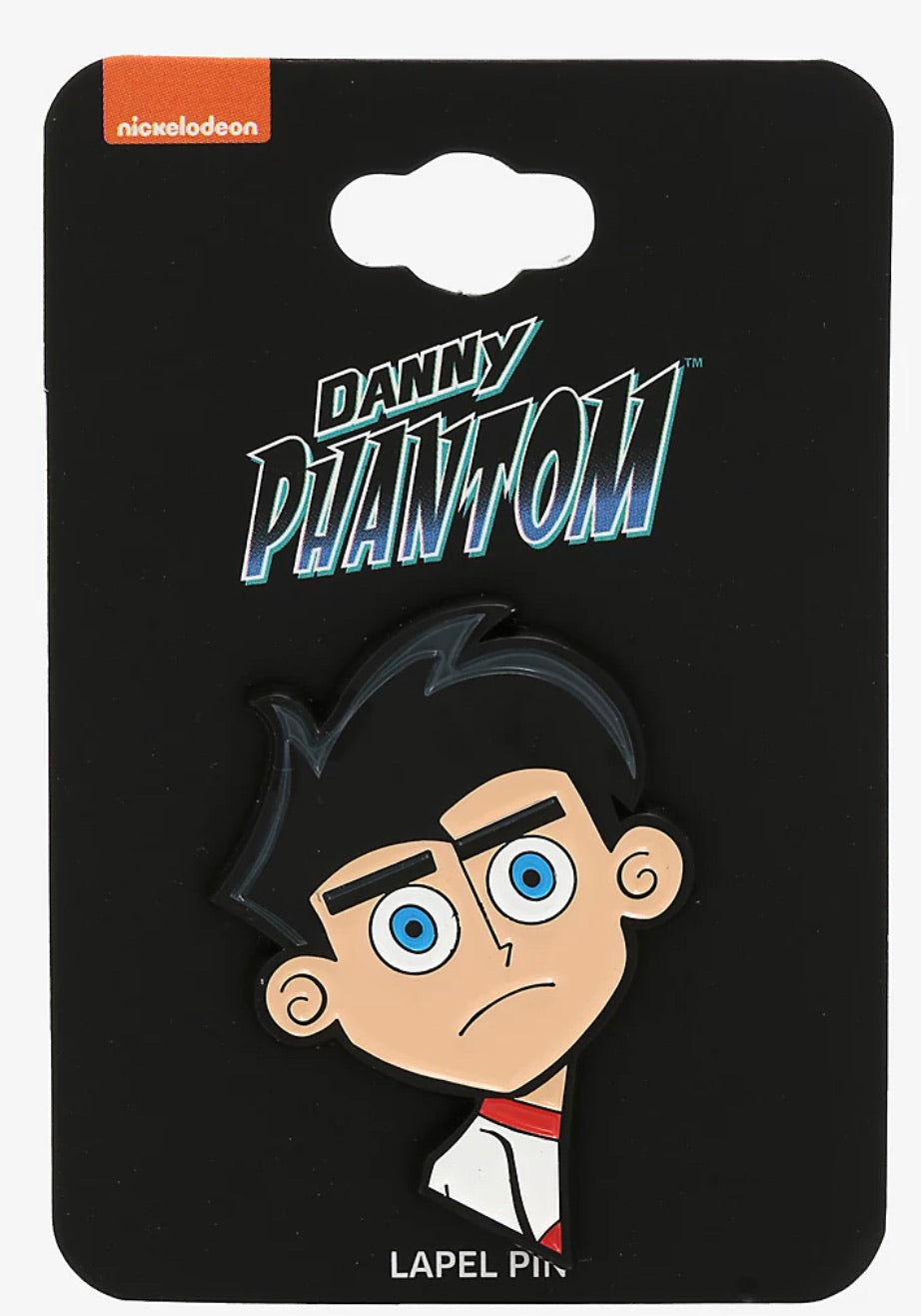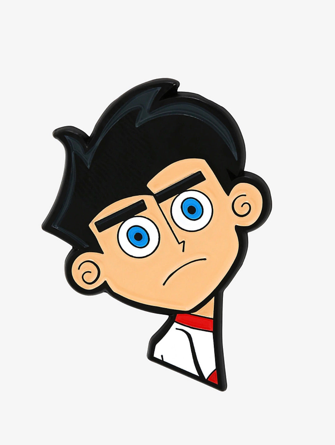 El adolescente mitad humano, mitad fantasma de la serie Nickelodeon tiene una expresión severa en este alfiler de esmalte.