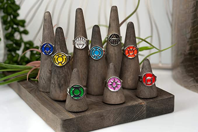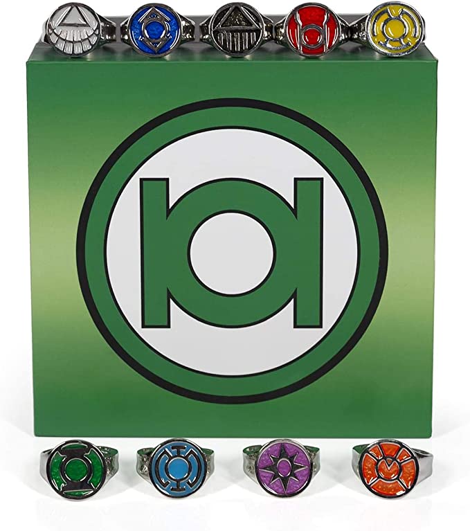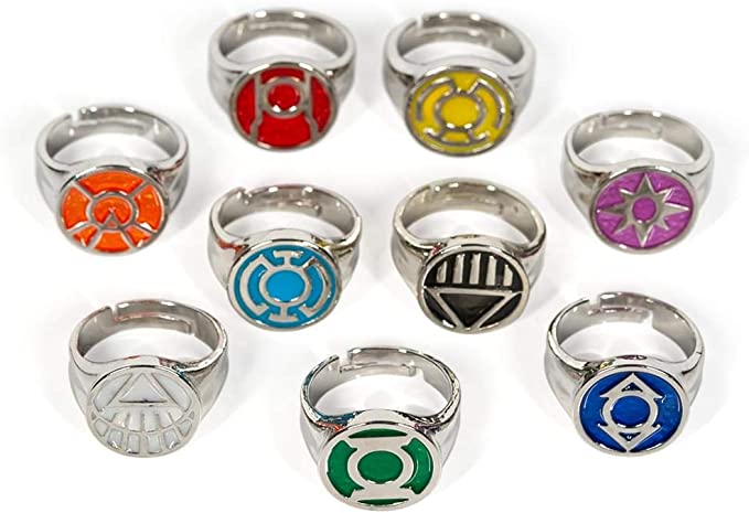 - Una colección de verdadero poder: este juego de anillos de poder de nueve piezas incluye verde (Willpower también utilizado por la linterna verde), rojo (Rage), naranja (Avarice), amarillo (esperanza), azul (esperanza), índigo (compasión), violeta (amor), blanco (vida), y negro (muerte).