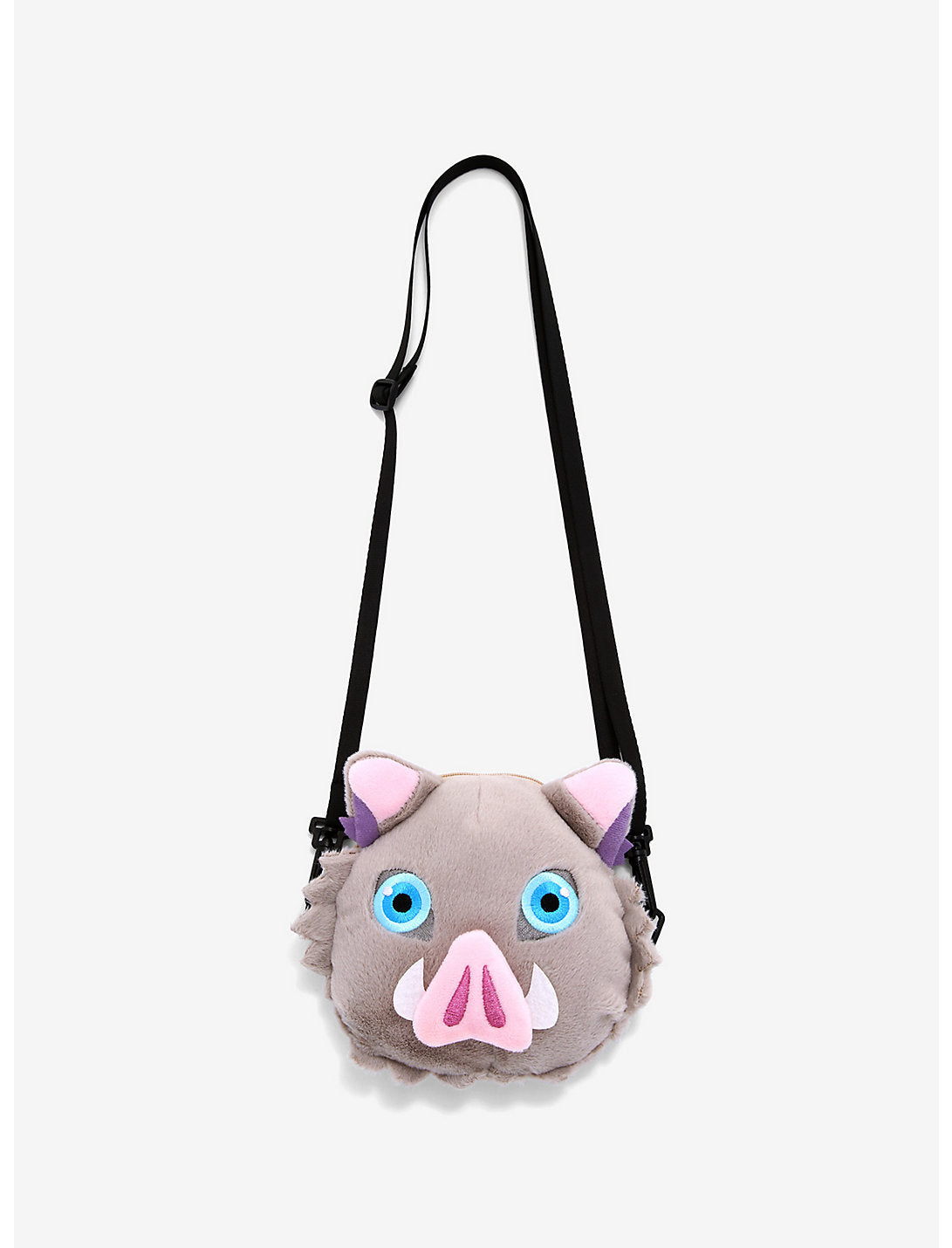 ¡Nosuke está listo para ayudarte a llevar tus cosas! De Demon Slayer: Kimetsu no Yaiba, esta bandolera presenta un diseño de felpa de la cabeza de jabalí de Inosuke. Cierre de cremallera superior.