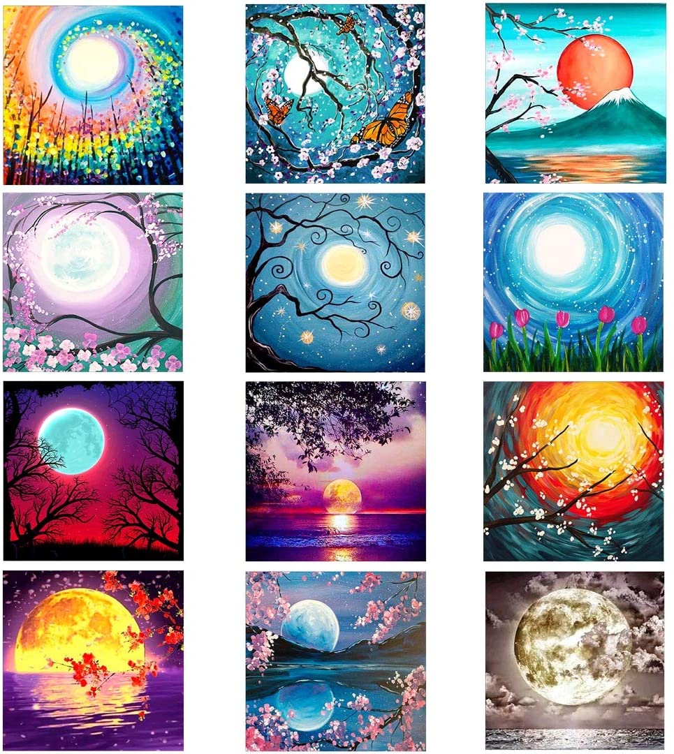 - El paquete incluye: 12 lienzos de pintura de diamante 5D de cobertura completa, de diseño de luna como en las imágenes, 12 bolígrafos para adherir diamantes, 12 arcillas adhesivas, 12 bandejas para diamantes, 1 pinza e instrucciones (idioma español no garantizado)