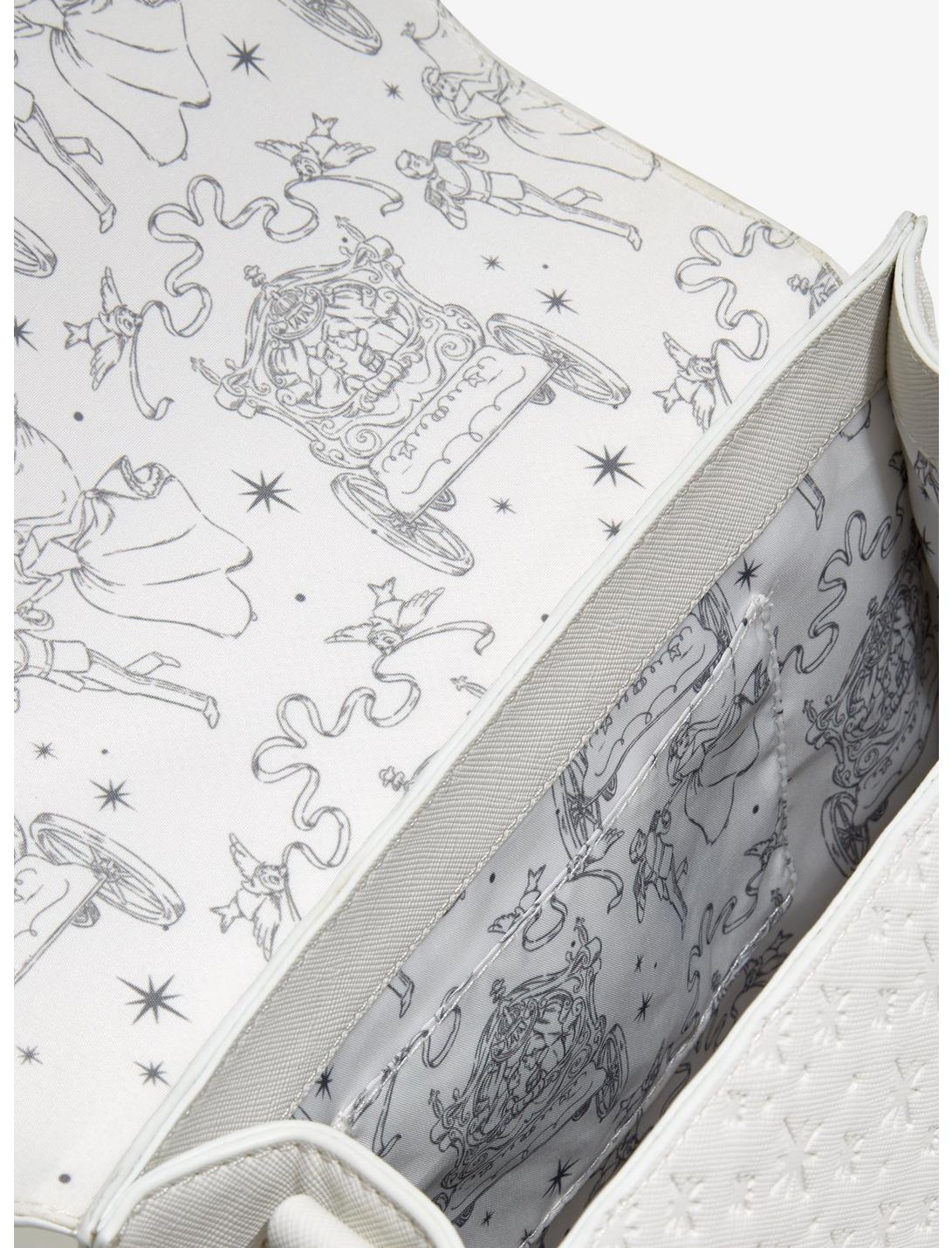 ¡Celebre un felices para siempre con este bolso Loungefly! Inspirado en Cenicienta, este bolso presenta apliques troquelados del castillo con detalles metalizados y Cenicienta con el príncipe azul en sus looks de boda con estrellas grabadas por todas partes. Con las letras "Y vivieron felices para siempre" rodeadas de pájaros en la parte posterior, este bolso viene con una correa cruzada removible y un asa superior para darle un poco de magia Disney a cualquier estilo.