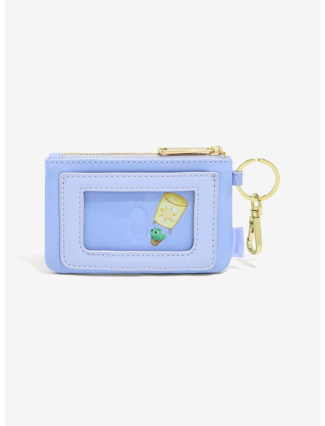 - ¡Rapunzel y sus padres están aquí para mantener tus tarjetas seguras! La familia real de Disney's Tangled mira un Corona Lantern en un lado de este tarjetero Loungefly. El otro lado presenta una funda de identificación transparente. El tarjetero también incluye un llavero, un clip y un compartimento con cremallera. ¡Pascal incluso hace una aparición especial!