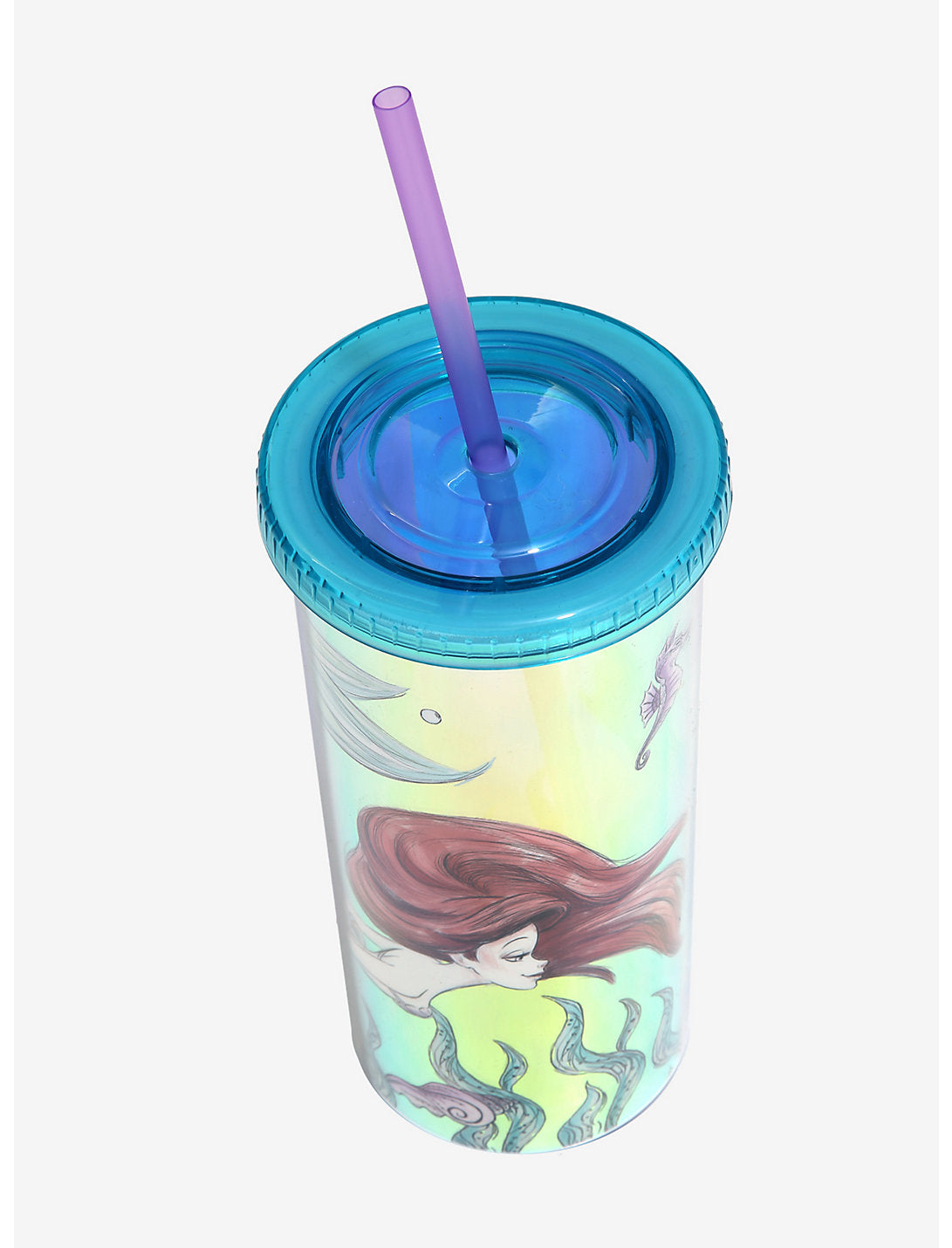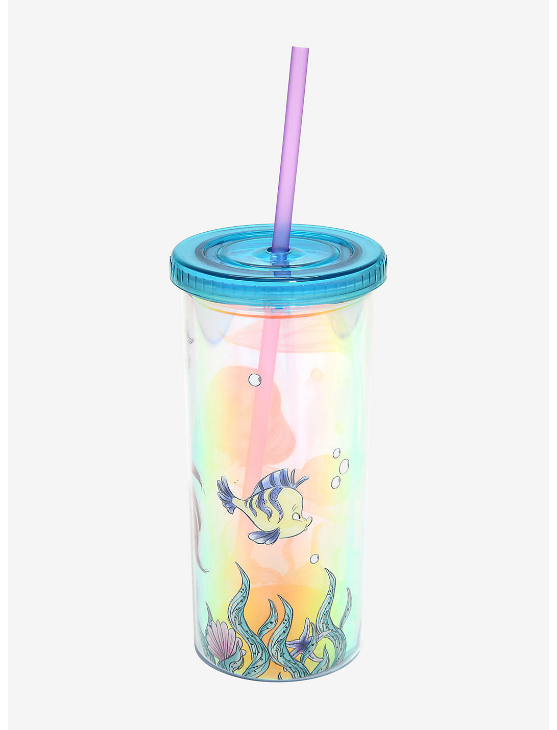 Haz que la hidratación forme parte de tu mundo con esta taza de viaje de La Sirenita. Impreso con un dibujo de Ariel y Flounder con algas y conchas. Con tapa de rosca turquesa y pajita violeta.