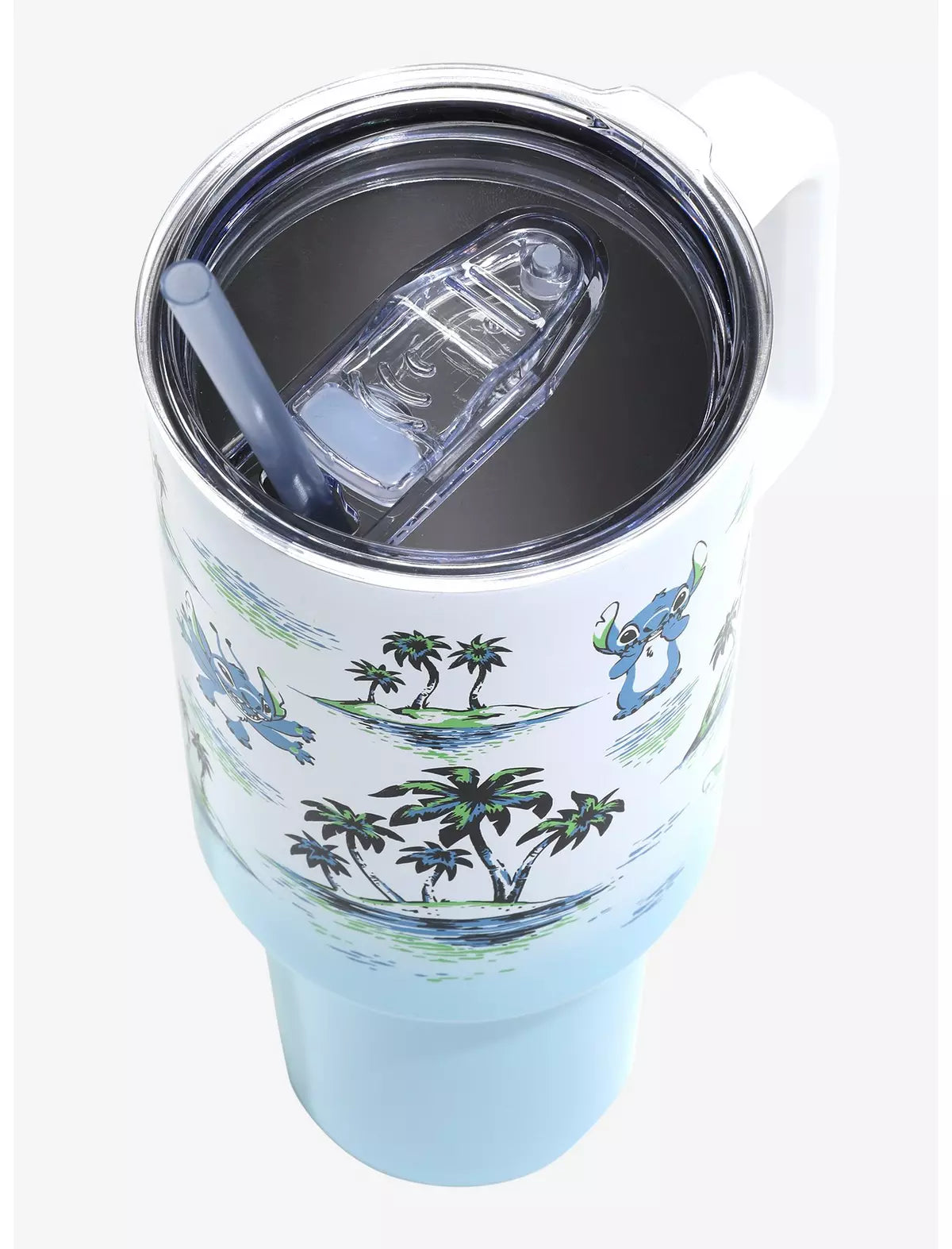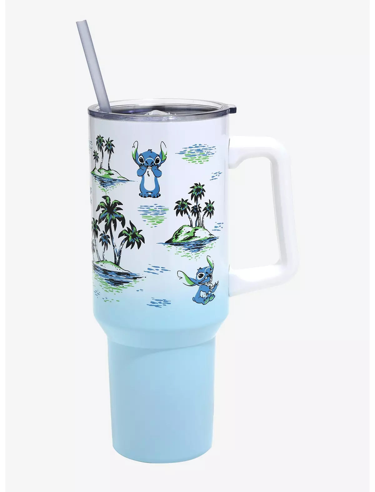 ¿Pasar el día en la playa con Stitch? ¡Asegúrate de mantenerte hidratado! Esta taza de viaje presenta un estampado integral de Stitch y vegetación hawaiana. Viene con asa, pajita extraíble y tapa de viaje.