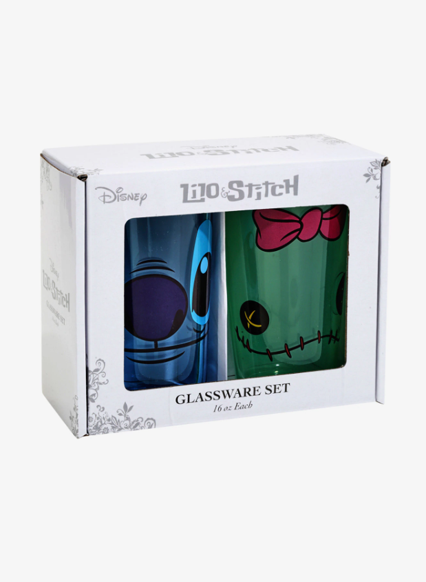 Relájese con una bebida fría de su elección después de un día lleno de diversión en la playa. Este juego de pintor de Lilo & Stitch de Disney presenta un vidrio azul teñido con la cara de Stitch y un vidrio verde teñido con la cara de Scrump.